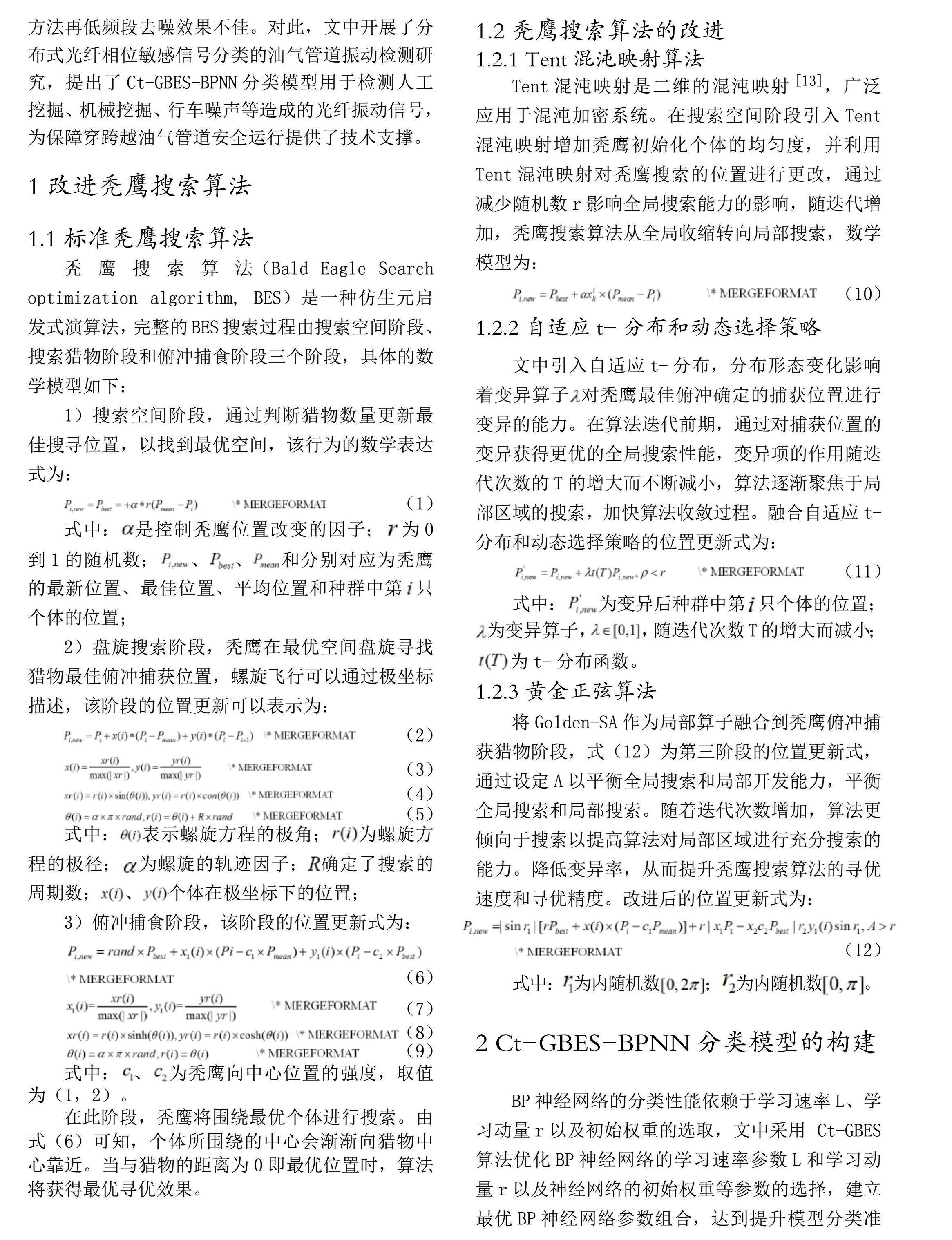 摘要:针对穿跨越油气管道人工巡检困难的问题,文中采用分布式光纤实时监测管道状态,对振动信号进行分类,识别管道振动源。提出改进的秃鹰搜索算法和光纤振动信号特征提取方法,并基于神经网络对分布式光纤相位敏感信号进行分类和识别。实验结果显示,文中提出的Ct-GBES-BPNN分类模型具有良好的分类识别效果,可为保障穿跨越油气管道安全提供支撑。(剩余7835字)