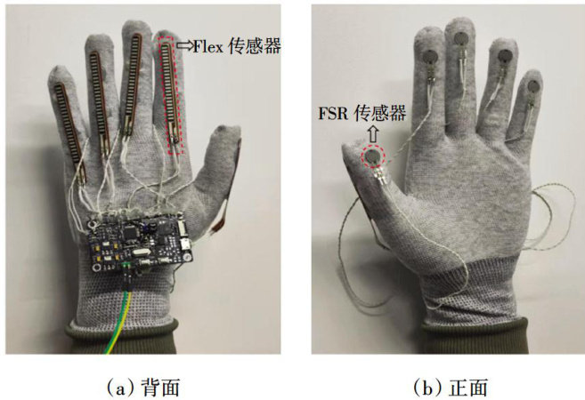 Abstract: To enhance the accuracyand stabilityof haptic perception in virtual reality(VR)systems,a wearable hapticsensing electronic glove and a VR system based on multi-sensor data fusion are proposed. Flexible bending sensors (Flex)are mounted on the back of each finger of the electronic glove to collct finger-bending information, and force-sensitive resistors (FSR)are placed at the fingertips for haptic sensing. The sensors are connected to the circuit board via impedance-divider circuitsand linked to an analog-to-digital converter(ADC)for signal digitization.Then,thedigital signals from thesensorsare filtered byadigital low-passfilterandtransmitted to custom-developed VR softwarevia serial communication.The system's viability is evaluated through various hand-gesture recognitions and object-grasping experiments. Results show that the system can sample hapticperception signals at 50Hz ,recognize 26-letter hand gestures with 85.31% accuracy,and precisely feed back finger- gripping forces during object-grasping tests.