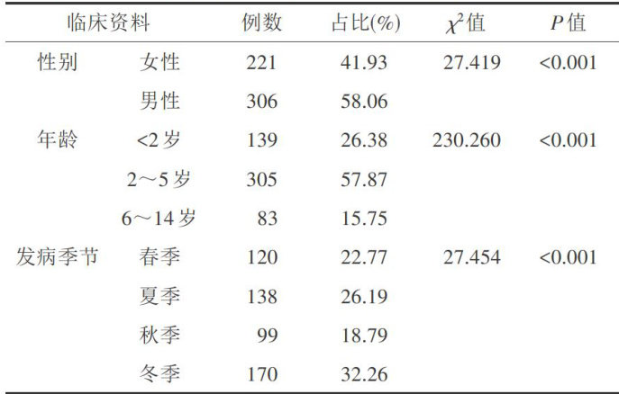 【Abstract】 Objective The epidemiological characteristics and drug resistance of invasive streptococcus pneumoniaedisease in children in Zhangzhou were analyzed to provideareference forrational use of antibiotics and standardized treatment.MethodsA total of 527 children diagnosed with childhood invasive streptococcus pneumoniae from January 2023 to December 2024 were selected as the research subjects.The epidemiological characteristicsof childhood invasive streptococcus pneumoniae disease in children were defined,and the sputumof the children wascolected for isolation,cultureof streptococcus pneumoniae,and antimicrobial susceptibility testing.ResultsAmong the 527children aged 0 to 14 years,those aged 2 to 5 years (57.87 % )had the highest prevalence of the disease,followed by those aged under 2 years old (26.38% )and thoseaged6to14 years ( 15.75% ) x2=230.260 P<0.001 ).Therewere306males ( 58.06% )and221 females (41.93% ),withamale-to-femaleratioof 1.38:1. The high incidence of invasive streptococcus pneumoniae occurred in winter (32.26% )and summer (26.19% 0 χ2 =27.454, P<0.001 ).The most common diagnosis was bronchopneumonia (81.02% ),followedbyacute bronchitis (7.21% ).Pneumococci show high resistance to erythromycin (98.48% )andclindamycin (95.83% ),with thelowest resistance rates observed for linezolid(( )% ),vancomycin( )% ),anddaptivir( 0% ).However,theyare highly sensitive to linezolid 100% ),daptivir( 100% ),andvancomycin( 100% ),with the lowest sensitivity being to cotrimoxazole (6.83% ),clindamycin( 3.98% ),and erythromycin (1.52% ).Conclusion Children under 5 years of age had the highest incidence of invasive pneumococcal disease,which occurred predominantly in winter and summer. Theincidence of maleis higher than that of female,and the diagnosis ismostly bronchopneumonia.Invasive streptococcuspneumococcal bacteriaare highlyresistant toerythromycinand clindamycin,and have thehighest sensitivity to linezolid,dafiputineand vancomycin
