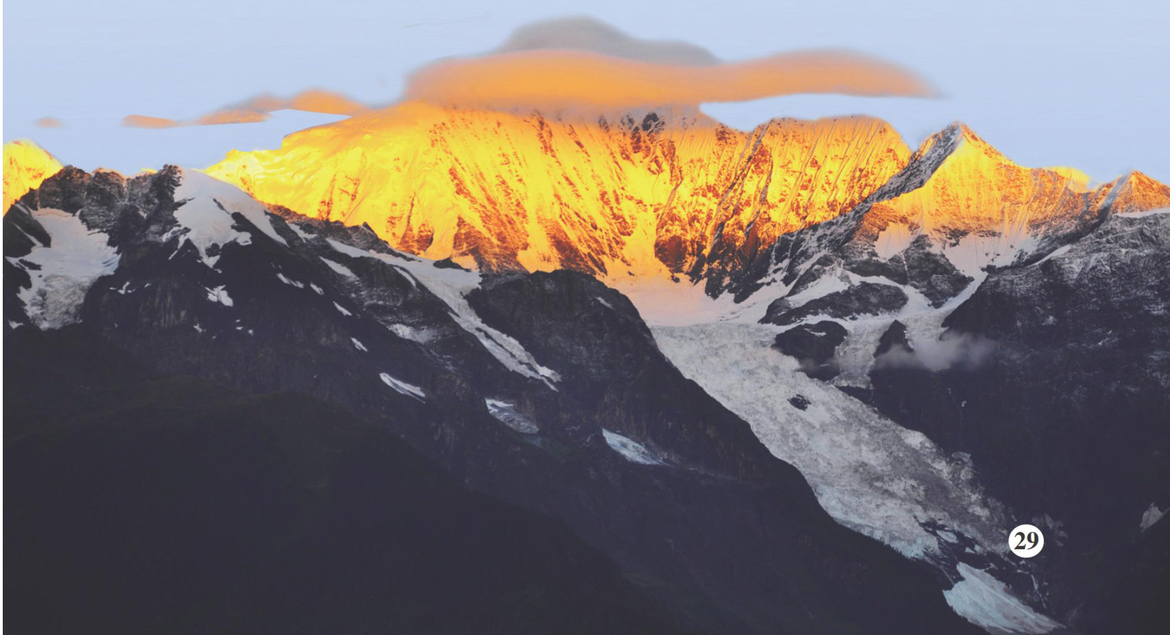 走着走着,小伙子不经意回头看了一眼身后的山峰,一下瞪大了双眼:只见在夕阳的映照下,博格达峰上的白雪散发出圣洁的光芒;在山峰上空,出现了一朵奇异的云,这朵云的底部与山峰连接,另一端稍稍向上挑起,看起来就像当地人戴的一种宽檐帽