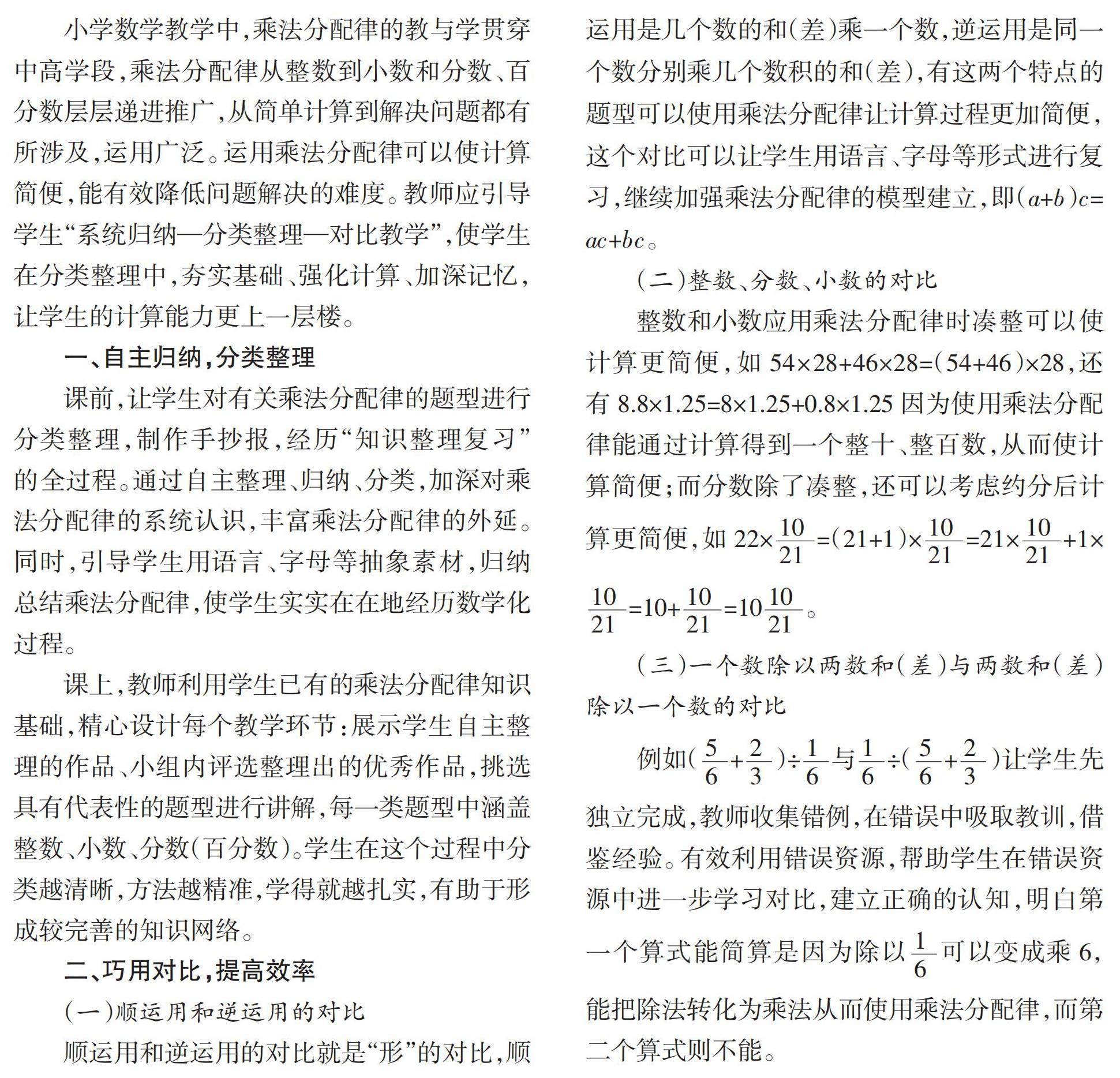 小学数学教学中,乘法分配律的教与学贯穿中高学段,乘法分配律从整数到小数和分数、百分数层层递进推广,从简单计算到解决问题都有所涉及,运用广泛。运用乘法分配律可以使计算简便,能有效降低问题解决的难度。教师应引导学生“系统归纳—分类整理—对比教学”,使学生在分类整理中,夯实基础、强化计算、加深记忆,让学生的计算能力更上一层楼。(剩余1322字)
