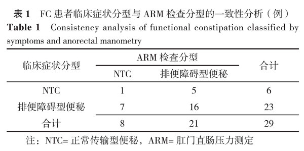 功能性便秘患者临床症状和结直肠肛门功能检查分型的一致性研究
