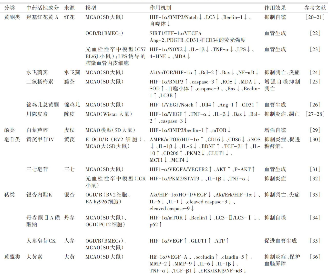 【Abstractshemicstroke(IS)isadiseasecausedbyinsuffcientbloodndoxygensupplytocerebralvesels,withthemainclinical manifestationsofhemiplegia,sensorydisturbance,aphasia,andataxia.Studieshaveshonthathypoxia-induciblefactorlα(HF1),athecoreregulatoryelementofoxygenhomeostasis,canberapidlyactivatedunderhpoxia/ischemiaconditions,trebyplaing animportantoleinthepathophysiolgyofIS.Inrecentyears,moreandmorearticleshaveshownthatheactivecomponentoftraditionalChinesemedicine,esepatentdugsdcompoudtraditioalesedicieprescptiosantivelylatet HIF- Π1∝α -related signaling pathwayinthe treatmentofIS,but there isnosystematicsummaryonregulationof the HIF-1αsignaling pathwayinthetreatmentofIS.Therefore,thisarticlemainlysummarizes thestructureand physiologicalactivityof HIF- ∇⋅l∝ and its mechanisms ofactioninISandreviewsrelated studiesonChinese medicinemonomersandcompound prescriptions inthetreatmentof IS inthe pastfiveyears inChinaandglobaly.ItispointedoutthattheChinese medicine monomersandcompound prescriptionscan repairbraintissue,allviatebraintissuedamage,andexertaterapeuticefectonISbyregulating theHF-1αpathwaytoprootean giogenesis,inhibitnuroinflmmatioandoxidativestress,promoteenergymetabolism,andrepairblood-brainbarierdamage. 【Key words】hypoxia-inducible factor 1α ;ischemic stroke ;angiogenesis;energy metabolism;blood-brain barrier