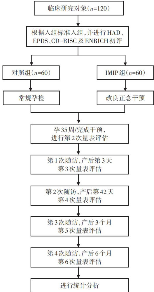 【AbstractObjective:Toexamine theefectsofanimprovedmindfuless-basedinterventionproram(IM)ondepresionniety, psychologicalresilience,and maritalqualityamong perinatal women.Methds:Weenroled20perinatal womenreceivingcareatthe obstetricsdepartmentsofPudongHospitalandNanhui MaternityandChildHealth HospitalfromDecember222 toAugust2O24.They wererandomlyassignedtoeitherroutinecaregrouporIMIPgroup.Theroutinecaregroupreceivedstandardprenatalcare,whilethe IMIPgroupreceived,inadditiontooutinecareanight-weekcourseofIIPintervention,dministeredonceaweek.Outcoemesures includedtheEdinburghPostatalDepressioncale(EPDS),HospitalAnietyandDepressonScale(HADS)ConorDavison ResilienceScale(CD-ISC),andECHMaritalSatisfactionScalessessdatsixtiepoints—beforeiterventionftee tion(at35 weeksofgestation),andat3days,42days,3months,and6months postpartum.Arepeated measures ANOVAwasconducted,with the score changes Δ values)at individual time points from baseline as the dependent variable.Results:The IMIP group showed significantly greater improvements than the routine care groupin EPDS,HADS-anxiety,CD-RISC,andENRICH scores, with the main effects of group and time and their interaction effect all being significant(all P<0.001 ).For HADS-depression,the groupXtime interaction was not significant,but the main effect of groupwas significant( P <0.001).CD-RISC and ENRICH scores increasedwithtimeintheIMIPgroup.Conclusion:IMIPeffectively alleviates depressive and anxiety symptoms,enhances psychological resilience,and improves maritalquality for perinatal women,showing strong potentialforclinical application.