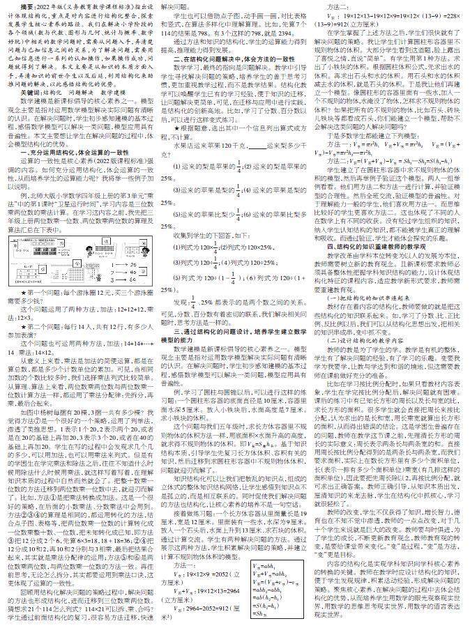 摘要:2022年版《义务教育数学课程标准》指出设计体现结构化,重点是对内容进行结构化整合,探索发展学生核心素养的路径。我们在解决小学阶段的各个领域(数与代数、图形与几何、统计与概率、数学好玩)中相关的数学问题时,需要从问题入手,弄清楚问题与已知信息之间的关系,为了解决问题,需要用已知信息进行一系列的认知操作,如果操作成功,问题就得到了解决。(剩余4158字)