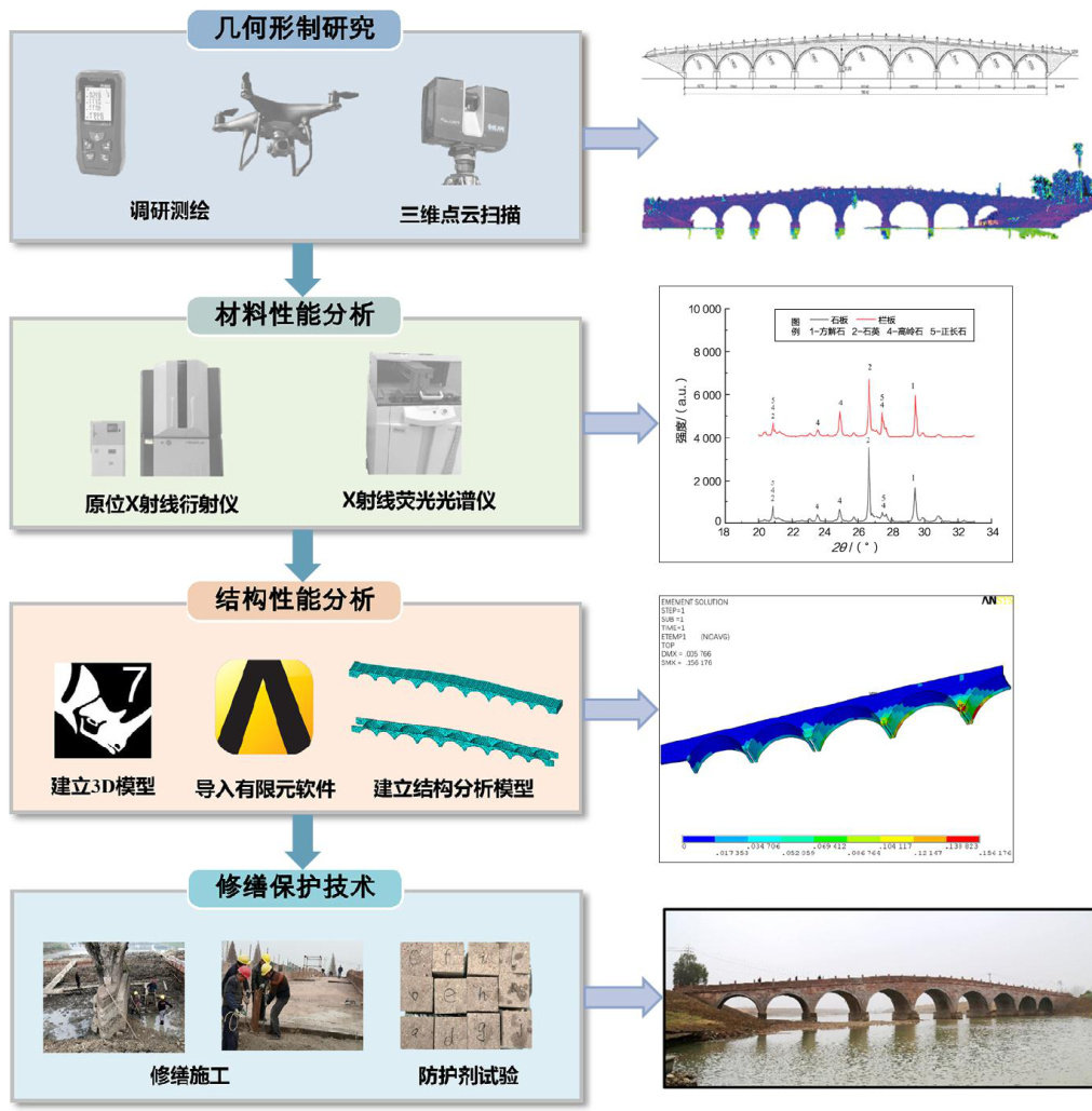 Abstract:Putang Bridge is a typical stone arch bridge fromthe Ming Dynasty.After years use,the bridge body has developed various damages and conditions,and research on adaptive conservation techniques that meet both aesthetic preservation and structural safety requirements is urgently needed. To ensure its scientific preservation, this paper combines a variety modern technologies to construct the framework for the repair and protection Putang Bridge. Through on-site investigation and the use 3D scanning technology, a point cloud model Putang Bridge was established. The types and areas damages Putang Bridge were mapped in detail,and the causes deterioration examined; Nondestructive testing using rebound methods, X-ray fluorescence spectroscopy(XRF), and X- ray diffraction(XRD) was employed to analyze the strength and composition the bridge's materials.A finite element model was developed according to the form, structure and material properties to conduct a component importance analysis and load impact assessment.Finally,by integrating the results the field survey, finite element analysis, and a comparative evaluation the protective effects three water repellents on the stone materials Putang Bridge,adaptive conservation strategies were proposed. The research outcome can provide reference for the protection ancient brick and stone arch bridges.