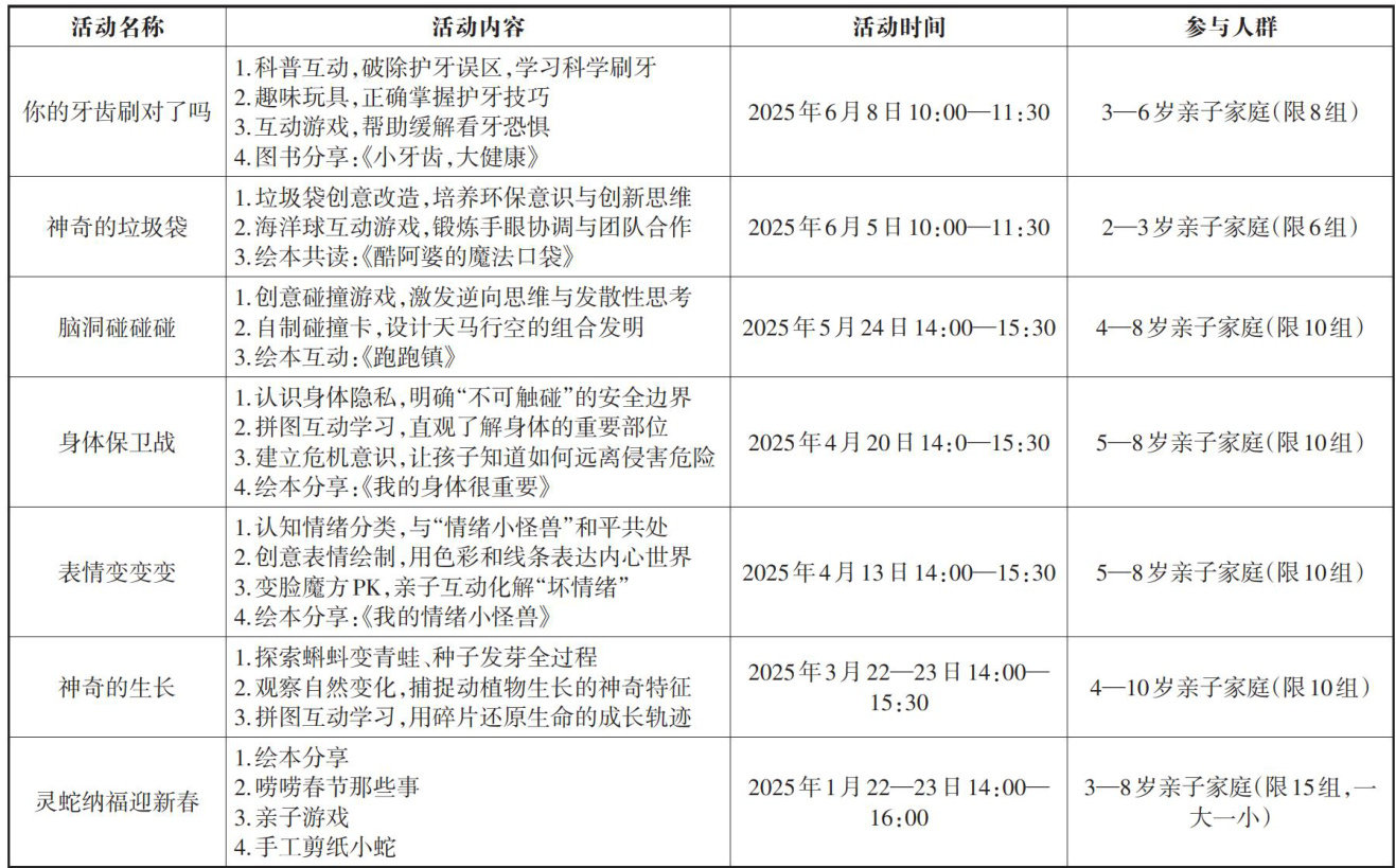 Abstract Toys playavital role in achild’s growth.Toy activity spaces in public libraries serve as important means to safeguardchildren'sright toplaysupportfamilyeducation,andcultivateanearlyemotionalconnectionbtweenchildren andlibraries.This paper takes the“Children’sEducationalToyLibrary”atBinjiang PublicLibrary—China’s pionering institution inexploring fullintellgenttoylibraryservices—asitsresearchsubject.Itanalyzes thelibrary’sdevelopment andservicepractices intermsof targetusers,access mehods,spatiallayout,serviceontent,colectionclassication,and management.The paper further summarizes itsdistinctive features inservice processs,facility planning,toycolections, themed activities,and new media promotion, to inform the intelligent development of toy libraries in China.