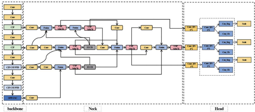 Abstract:In view of the problems of insufficient accuracy,a complex structure and por real-time performance of the particleboard surface defect detection algorithm,this paper proposes an improved YOLOv8 lightweight detection algorithm.By introducing the C2F - CT module to enhance the model's understanding and utilization of image information,the detectionaccuracy and efficiency are improved.Meanwhile,SPPF is replaced bythe SPPF-FSC module to optimize feature extraction and reduce redundancy.EMFPN is used to replace PAN-FPN to enhance key feature learninganddetail capture.Finaly,the lightweight detection head LSCBD is introduced tooptimize the localization and classification performance. The experiments show that the improved algorithm achieves 94.4% and 1.8% improvement in mAP index,and the number of model parameters and computation amount are reduced to 1.78M and 5. 6GFLOPs,respectively,which realizes the purpose of saving computational resources and satisfying real-time inspection of the production line while improving detection accuracy.