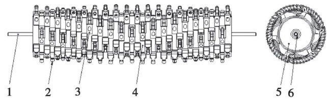 农田碎石机的破碎装置是一个镶嵌刀具的转子机构,转子主要由轴、刀具、刀座、滚筒、滚筒端盖、胀紧套组成,具体结构如图1所示。(剩余5395字)