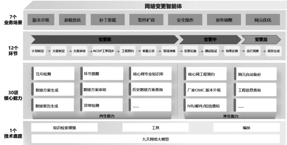 Abstract: To address issues such as insufcient pre-event risk assessment,non-standard in-event operations,and lack of post-event racking incommunication network change operations,this paper takes thepractice ofChina Mobile Communications Group Fujan Co.,Ltd.as aresearchcase to design and construct a network change intellgent agent based on China Mobile's Jiutian Large Model.The intelligent agent integrates knowledge graph and RAG (RetrievalAugmented Generation)technology to build a full-process inteligent system for network changes covering 12 links and 7 scenarios,realizing core functions including automatic scheme generation,dynamic risk identification,and second-level abnormal disposal.Application data in 2O24 shows that the duration of network change operations is shortened by 68% ,thehuman-caused accident rateisreduced to O,theaccuracy of risk identification reaches 92% and the efficiency of scheme generation is improved by 80% .This system effectively promotes the transformation of network operation and maintenance from "experience-driven" to "data-driven"and provides a replicable intellgent solution for network security assurance in the communication industry.