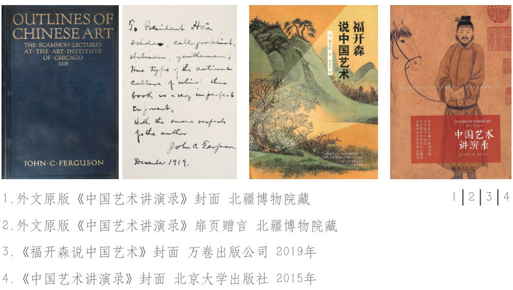 天津北疆博物院藏有一本美国学者福开森赠送给北洋政府大总统徐世昌的外文原版著作《中国艺术讲演录》,该书于1919由年芝加哥大学出版社出版。图书扉页作者写道: