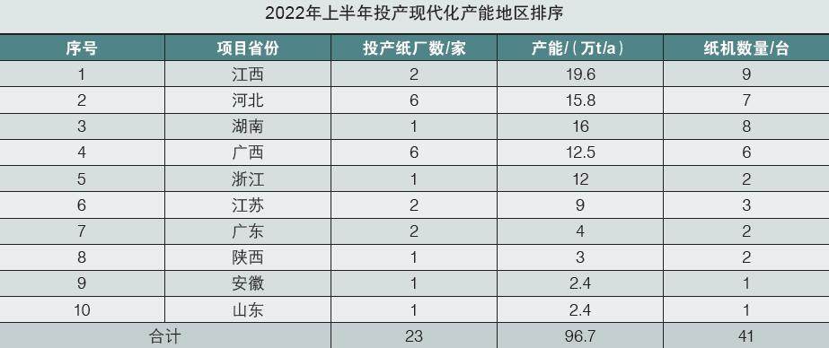 (本刊讯)据中国制浆造纸研究院有限公司调研汇总,2022年1—6月,行业新投产现代化产能约96.7万t/a,共41台纸机,包括国产纸机37台、进口纸机4台。其中,第一季度投产62.4万t,第二季度投产34.3万t。