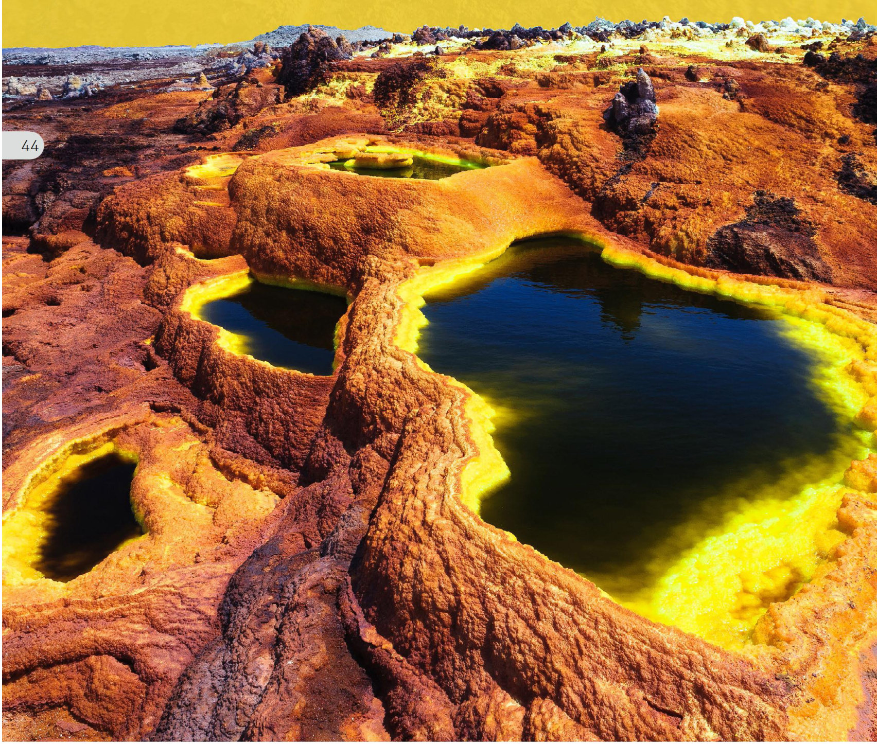 这里的地表覆盖着柠檬黄、翡翠绿、铁锈红的盐晶与硫黄沉积物,远看美丽得像一幅壁画;这里也被描述成一个鬼城。2005年之后,埃塞俄比亚中央统计局的人口报告中,就已经没有此地区的人口数据;这里是世界上最遥远、最荒芜的地区之一,没有学校、没有商店,也没有公路,对外交通除了游客车队,就只有前往该地收集盐块的阿法尔人与骆驼;这里的夏季地表温度最高可达 93.9∘mathsfC ,就连生命力最顽强的微生物都难以在此立足…