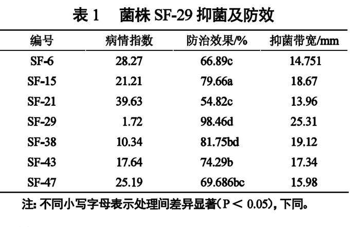 摘 要:采用平板对峙法和离体叶片防效法,测定从深州蜜桃果园发病植株的健康桃果实中分离筛选出生防菌株枯草芽孢杆菌SF-29对桃树黑星病病原菌嗜果枝孢菌的抑制作用。结果表明:菌株SF-29能够分泌胞外抑菌物质,对嗜果枝孢菌孢子萌发抑制率达到93.28%。