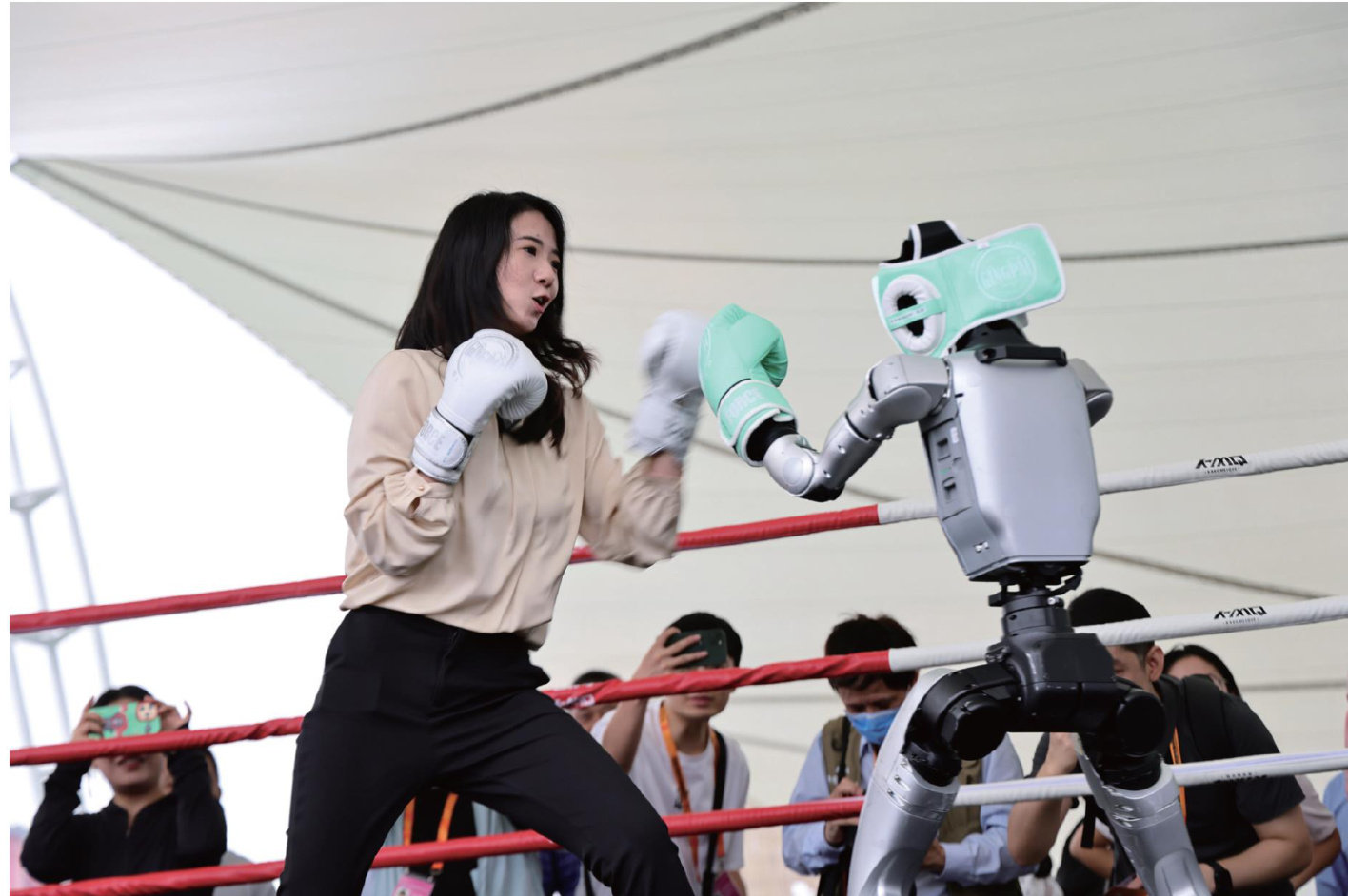 2025年9月10日.2025年中国国际服务贸易交易会在北京首钢园开幕,观众与人形机器人进行拳击比赛(图片来源/)