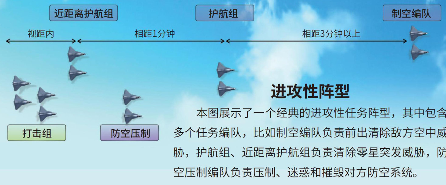 在常规空中交战中,一组战术编队通常由2至4架战机组成,可排成多种编队,如“一字战术横队”,这是最基础的战术队形,各飞机保持约2千米的横向间隔,高度差在300米至1000米间。(剩余287字)
