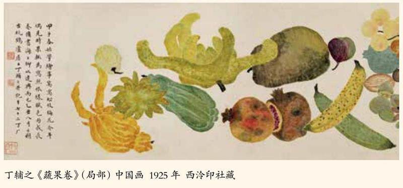 近代中国绘画史上,西泠印社创始人之一丁辅之(1879—1949)是一位不容忽视的重要画家。本文以《蔬果图》为例,从金石学统、图式经营、技法革新三重维度,揭示其以篆籀笔法重构文人画体系、以天文象数统摄画面时空秩序、以色墨互破拓展没骨法的创变实践。