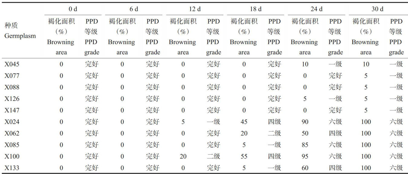 Abstract:Postharvest physiological deterioration (PPD) poses a’significant constraint to the commercialization of cassava.In this study,we evaluated 166 germplasms from Xinxuan 048(XX048) inbred cassava line.The degree of tuber decay was assessed at 0,6,12,18,24 and 30 days postharvest,with corresponding physiological indicators measured.The results showed that X045,X126, X077, X088,and X147 browning occurred later. Notably the browning areas in the five germplasms remained below 10% (PPD Grade 1) by 30 day,indicating superior storage tolerance. In contrast, X024, X062,X085, X100,and X133 showed browning occurred earlier. After 24 days,the browning area in these germplasms exceded 50% ,and reaching 100% (PPD Grade 6)by 30day ,demonstrating their poor storage tolerance. These germplasms can serve as excellent resources for storage tolerance cassava breeding.Starch and dry matter contents are lower in storable germplasms,while β -carotene content is higher. MDA content and antioxidant enzyme(SOD,CAT,POD) activities increase significantly in the late storage phase,and greater increments in non-storable germplasms. Correlation analysis showed that the browning area was positively correlated with dry mater content,starch content and POD enzyme activity,while also showing positive associations with SOD and CAT enzyme activity as well as MDA content. Conversely,a negative correlation was observed with β -carotene content. These results suggest that cassava tubers with high dry mater content and starch content are more susceptible to postharvest decay and exhibit weak PPD resistance.This study provides valuable data for investigating the mechanisms underlying PPD resistance in cassava and supports the breeding of PPD-resistant varieties.The identified germplasms ofer a foundation for further research on storage tolerance,PPD resistance mechanisms,and cassava breeding program. These findings hold significant implications for cassva cultivation and postharvest management.