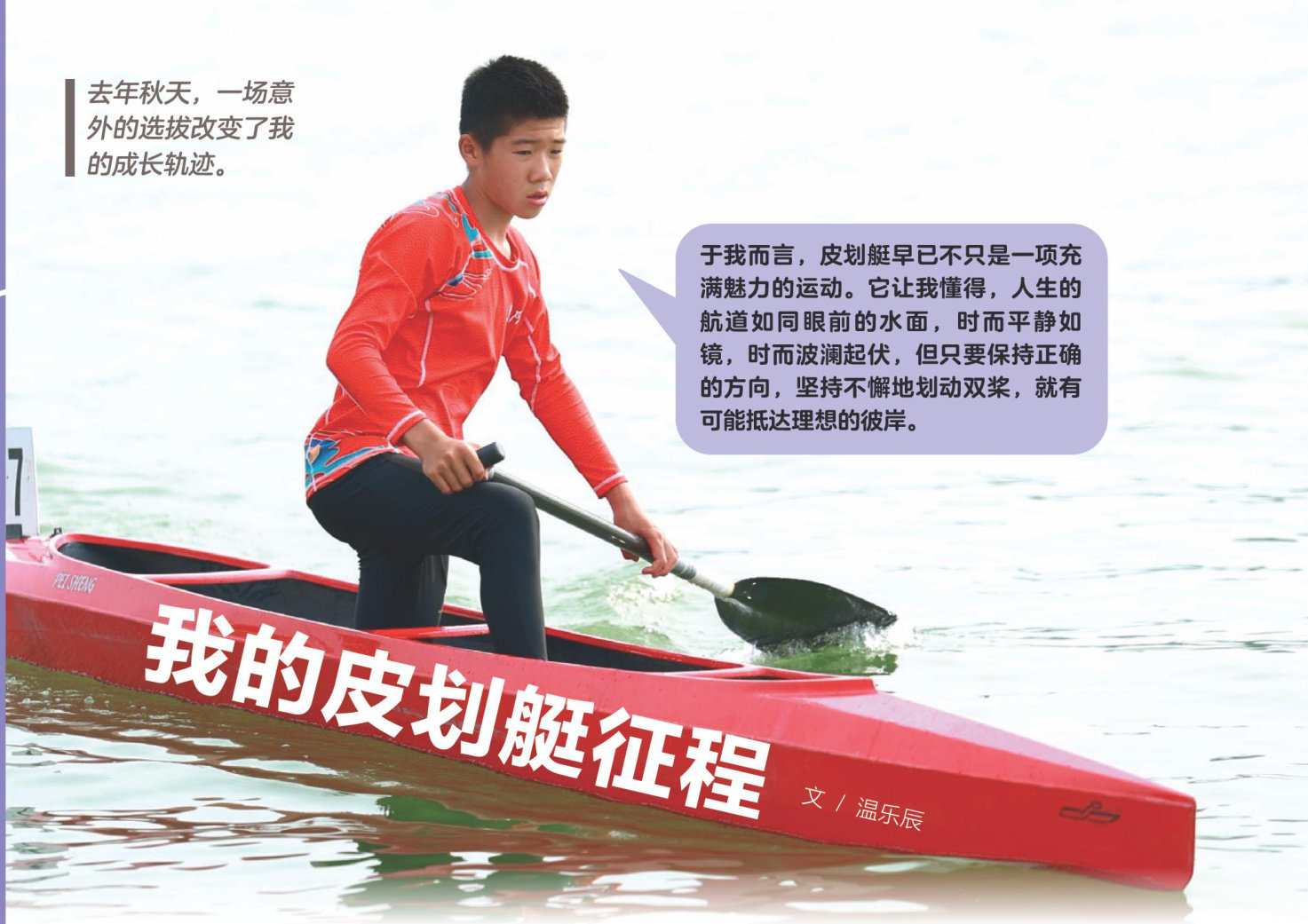 刚踏入初中校园,我怀着对水上运动的好奇与向往,试着参加校皮划艇队选拔,竟成功入选。这次尝试不仅让我接触到了一项全新的运动,更让我在挥桨逐浪中深刻体会到体育精神对成长的深远影响。