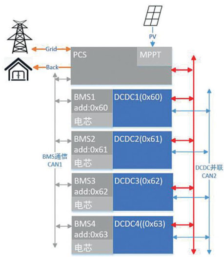 储能系统中的电池包为了适应不同的容量,一般需要多包并联[1]。为解决多个电池包并联的电压适配问题,一些厂商在电池包中内置DCDC(直流变换器),以提高电池包电压[2,这样的好处是:可调节升压后的电池包电压,解决并联电压适配的问题;可控制电池包的充放电电流,方便对电芯进行均衡。
