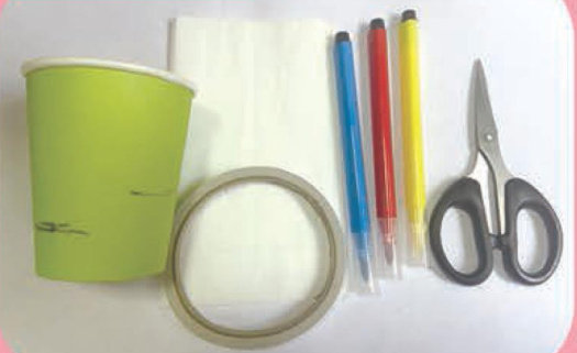 各色水彩笔、纸杯、餐巾纸、胶带、剪刀