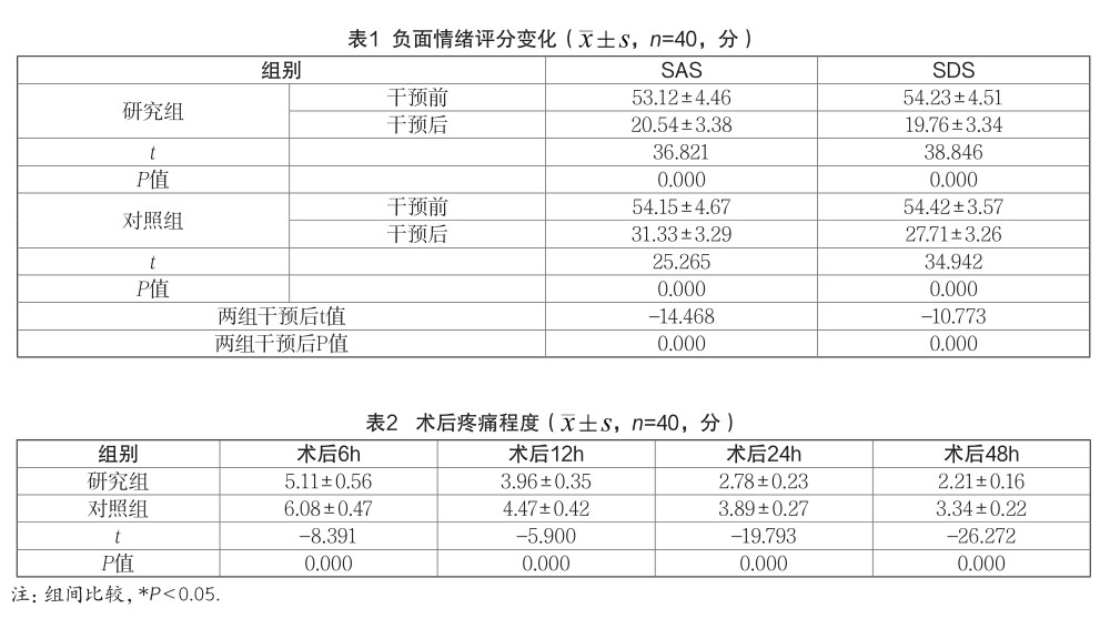 摘 要:目的:探讨快速康复标准化护理在保胆取石术患者中的应用效果。方法:收集2022年3月至12月收治的80例保胆取石术患者,随机分组,各40例,对照组与研究组患者分别接受常规护理与快速康复标准化护理,对比两组护理差异。结果:与对照组相比,研究组的SAS与SDS评分更低(P
