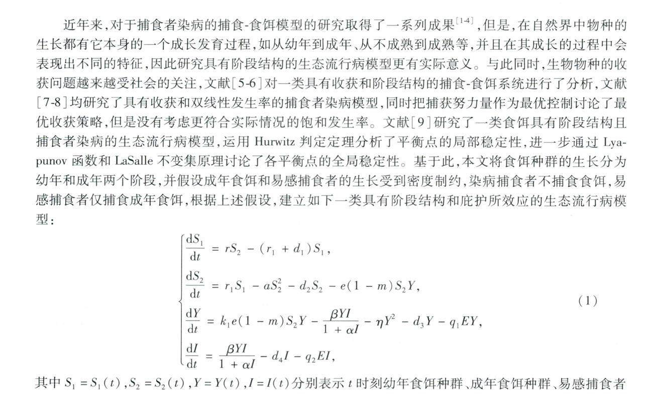 摘 要: 讨论了一类具有阶段结构和庇护所效应的生态流行病模型,假设疾病仅在捕食种群之间传播,同时考虑了饱和发生率,首先利用Routh-Hurwitz判据研究了非负平衡点的局部稳定性,然后通过构造Lyapunov函数并结合LaSalle不变集原理得到了平衡点全局渐近稳定的充分条件,最后利用Pontryagin最大值原理研究了最优收获策略。(剩余2651字)
