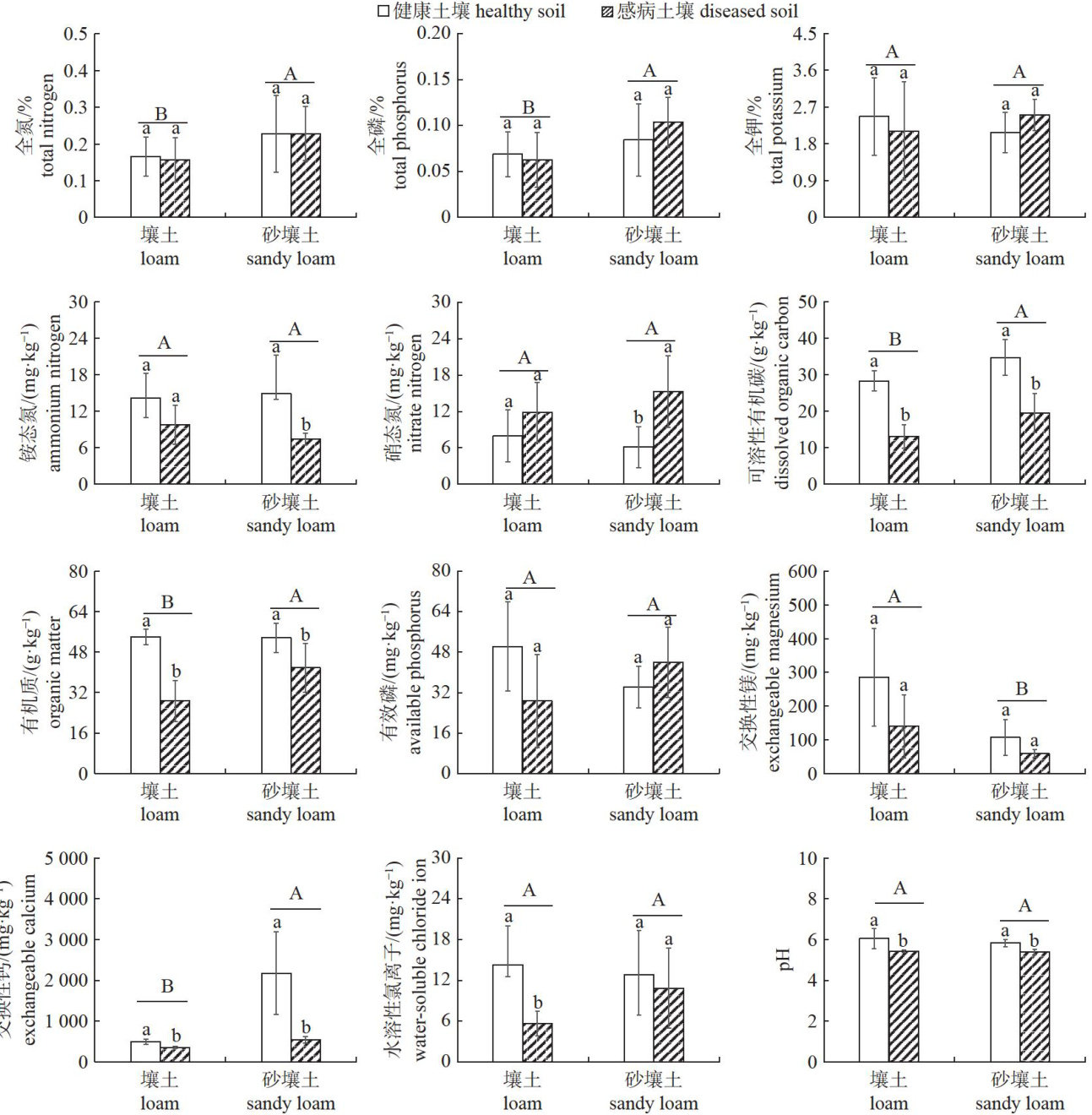 301.76% ,and 8.16% ,respectively. The porosity of healthy soils was significantly higher,and the bulk density was significantly lower than that of diseased soils in both soil types.Soil texture analysis indicated that coarse silt was the dominant particle fraction in both healthy and diseased soils,accounting for 29.90%-30.97% in loam and 36.18%-38.03% in sandy loam. Principal component analysis demonstrated extremely significant diffrences between healthy and diseased soil in overall characteristics, primarily atributed to variations along the first principal component (PC1). PC1 was mainly driven by indicators such as bulk density,porosity,organic matter, dissolved organic carbon, superoxide dismutase, microbial biomass nitrogen, catalase, microbial biomass carbon, ammonium nitrogen, and pH value.[Conclusion] The rhizosphere soil of healthy tobacco plants is characterized by higher porosity,organic mater content, dissolved organic carbon content, microbial biomass nitrogen, superoxide dismutase activity, catalase activity, and pH, as wellas lower bulk density and microbial biomass carbon.