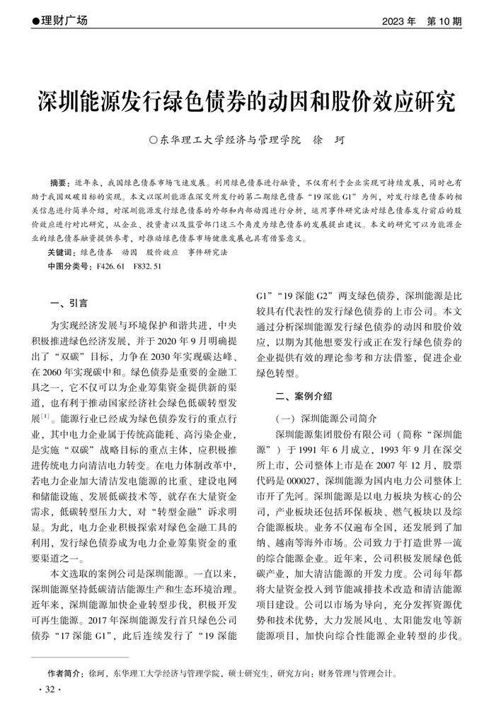 摘要:近年来,我国绿色债券市场飞速发展。利用绿色债券进行融资,不仅有利于企业实现可持续发展,同时也有助于我国双碳目标的实现。本文以深圳能源在深交所发行的第二期绿色债券“19深能G1”为例,对发行绿色债券的相关信息进行简单介绍,对深圳能源发行绿色债券的外部和内部动因进行分析,运用事件研究法对绿色债券发行前后的股价效应进行对比研究,从企业、投资者以及监管部门这三个角度为绿色债券的发展提出建议。(剩余6234字)