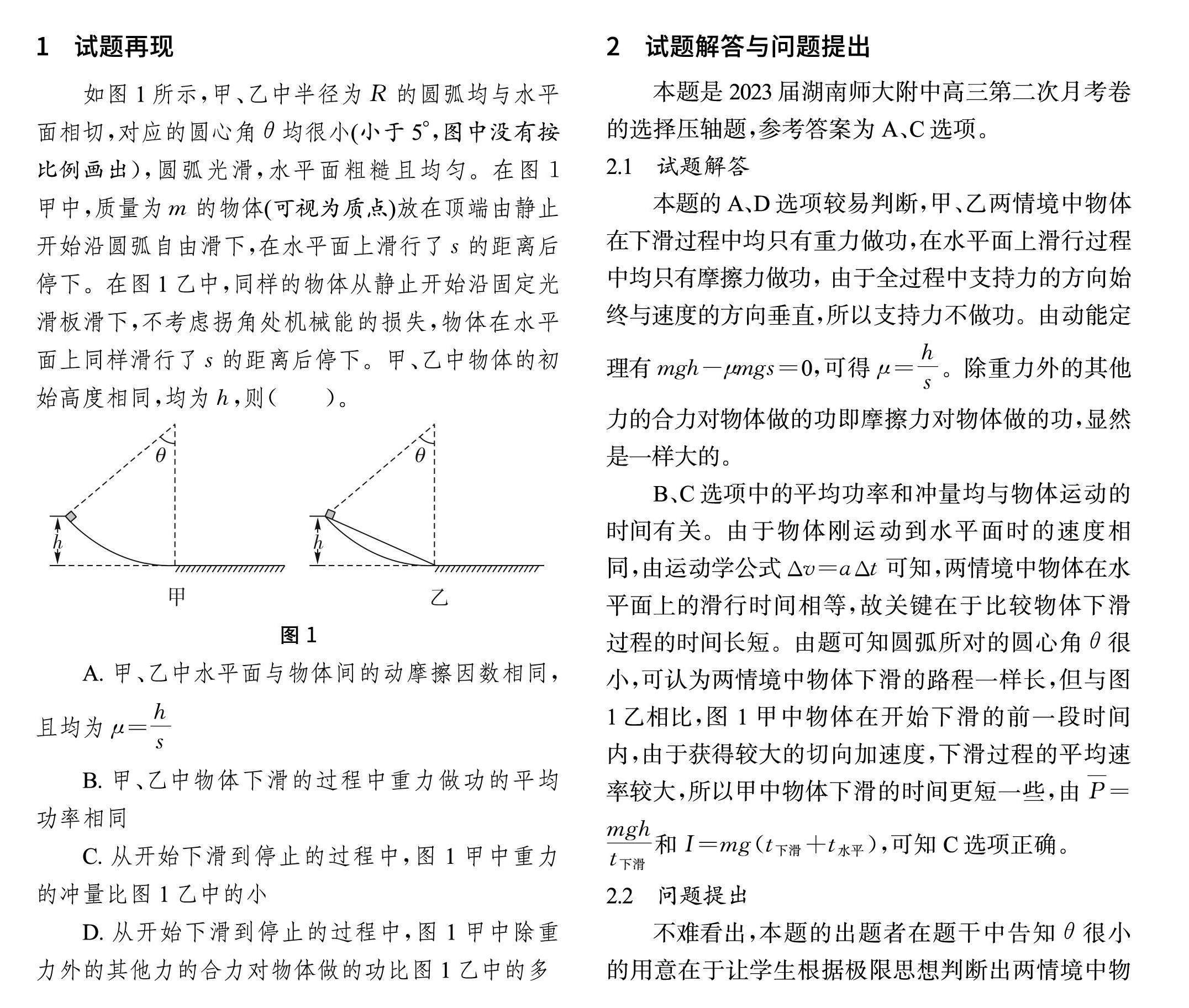 摘 要:本文先就一道模拟题给出了解答,基于该题题设的情境提出了更一般化的问题,并分别从几何和积分两个角度定量地对问题作出了解答,得出物体在自身重力作用下沿14光滑圆弧下滑的时间小于其沿直线下滑时间的结论。文章最后简单介绍了最速降线,并通过实验给出了物体沿不同轨道下滑时间长短关系的一般规律。希望能为此类问题的解答提供思路。(剩余3555字)