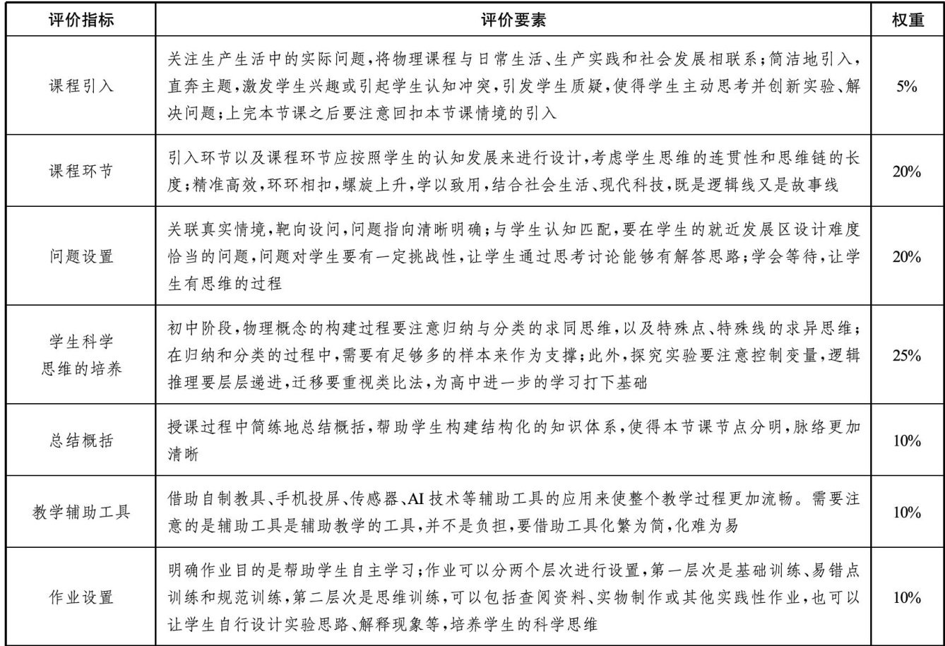 “教育、科技、人才是中国式现代化的基础性、战略性支撑”。科技类人才的培养与物理学科的评价方式和评价内容息息相关。评价一直以来都是一个重点研究领域。20世纪90年代,阎金铎先生主编的《中学物理教学概论》中就给出了中学物理课堂教学质量评价表,此表从教学目标、教学内容、教学方法、教学效果4个维度具体分化了10个评价项目,以“很好、较好、一般、较差、很差"作为教学质量的评价等级。(剩余4159字)