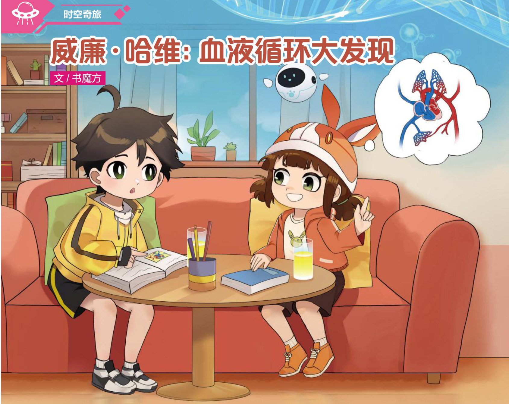 萌小奇和萌小漫正坐在书房的沙发上,翻看着一本厚厚的《人体大百科》。书页上密密麻麻的文字和多彩的插图吸引了他们的注意力,尤其是其中一幅彩色的《血液循环图》。