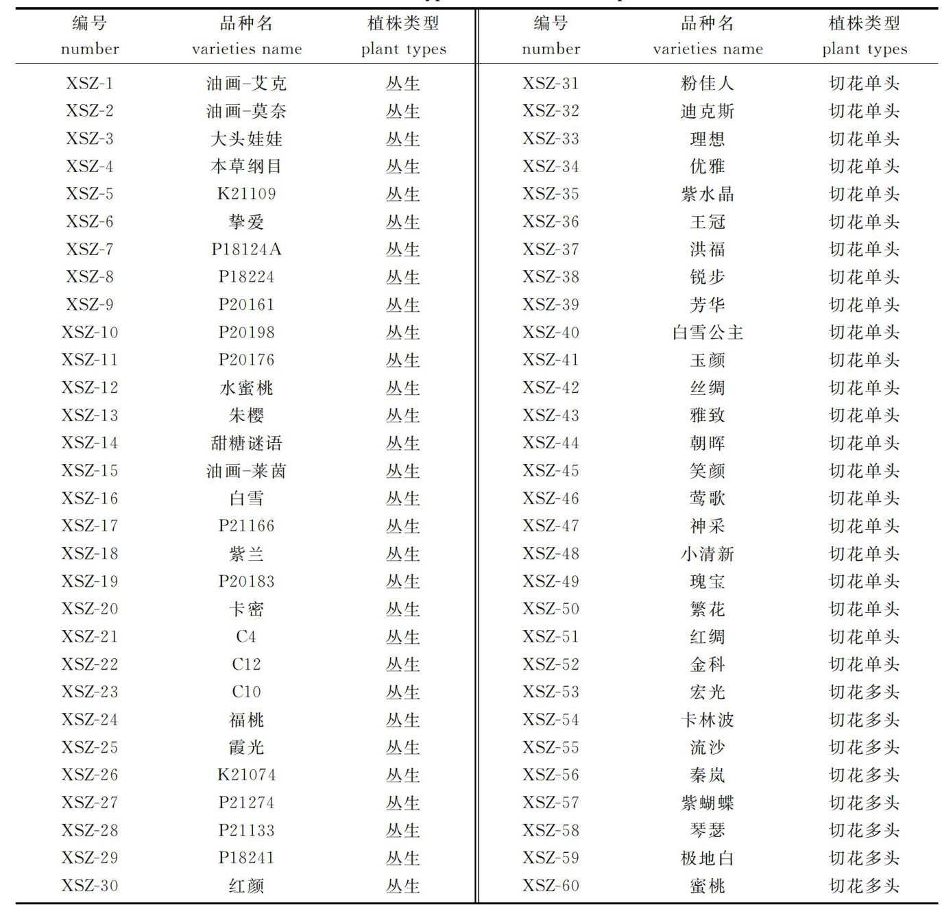 ABSTRACT: Carnation is oneof the most important flowers in the world,with rich colors,elegant flower shapes and a longfreshnessperiodascutflowers.Toanalyze thegenetic diversityofcarnationintermsofloraltraits,1lquantitative floral traitsand 2Oqualitative/pseudo-qualitativefloraltraits of 6O carnation cultivars were tested in accordance with the existing national standard ( .GB/T19557.23-2018) . Diversity analysis,correlation analysis,and principal component analysis wereconducted,along withclusteranalysisof thecultivarsandcomprehensiveevaluationof theirornamental value.Theresults showed that thecoeficientsof variation(CV)forthe1lquantitative traits within species ranged from 3.42% to 10.87% ,while the CV among varieties ranged from 12.74% to 42.19% . The diversity indices for quantitative traits ranged from 1.020to1.666,andthoseforqualitativeor pseudo-qualitative traitsranged fromO.085 to2.079,indicatingrichgenetic diversity.Among the465 traitcombinations,atotalof36 pairsof traits exhibited significantcorrelations,and thecorrelationcoeficientbetweenquantitativetraits(O.844)wasrelativelyhigh.Thecumulativecontribution rate of the nine principal components reached 80.083% ,and an ornamental value evaluation model for carnations was established, with planttypeand numberofflowers identifiedas the mostcriticalinfluencing factors.Clusteranalysis divided 6O cultivars into 4categories. Category I was the monochromatic group;category I was the multicolored group with no anthocyanin coloration in thecalyx;category Il was thelarge-flower group withcrenate and serrte petaledge incisions;category IV was the large-flower group with anthocyanin coloration in the calyx and a reddish hue.The findings of this study enrich the phenotypicdatabaseofcarnations,providecritical references foreffective variety identification,andofervaluable insights for breeding and selection of new cultivars.