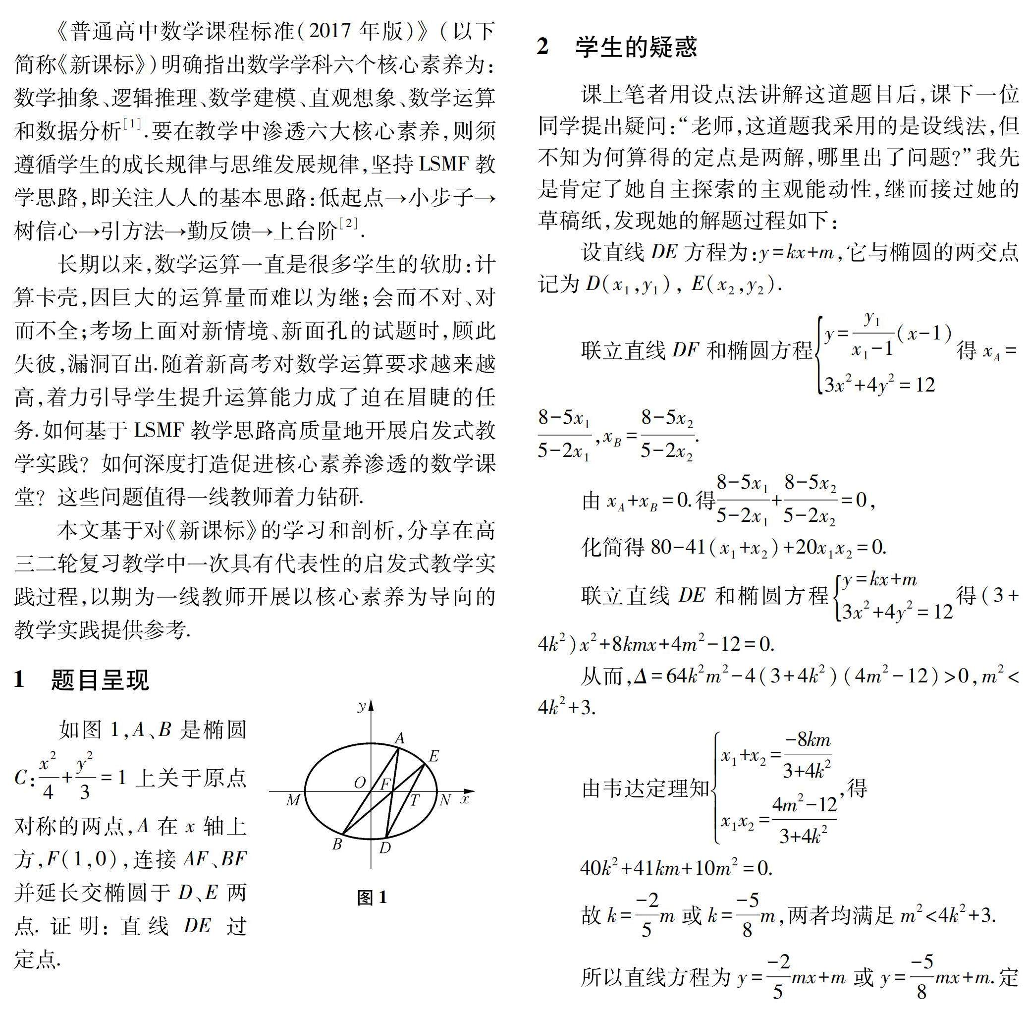 摘 要:《普通高中数学课程标准(2017 年版)》明确提出数学学科的六大核心素养.课堂是教学的载体,本文通过对一道圆锥曲线问题的启发式教学实践,具体探讨在数学教学中如何找准起点、踏实步子、树好信心、引清方法、做好反馈、引导学生登上台阶,从而实现核心素养的提升.