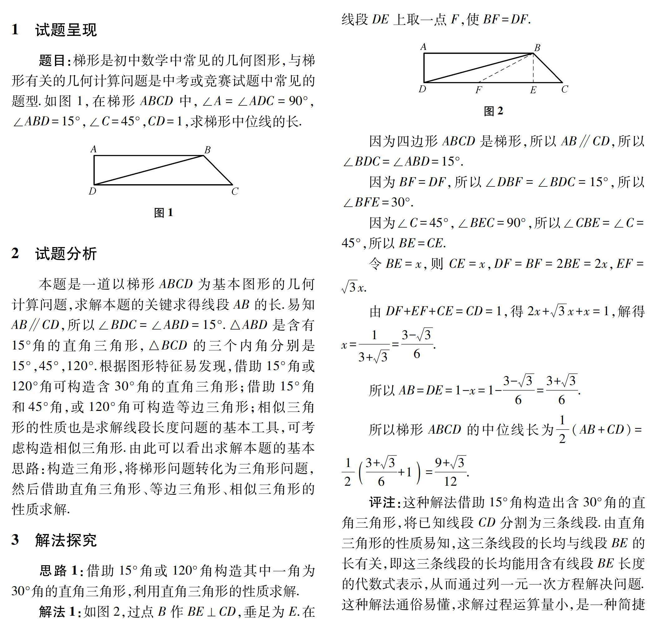 摘 要:对第7届世界团体锦标赛少年组团体赛第17题的解法进行了深入研究,通过构造三角形将梯形问题转化为三角形问题.利用三角形的性质得到了多种解法.一是借助15°角构造其中一角为30°角的直角三角形,再运用勾股定理求解;二是借助15°角和45°角,或120°角构造等边三角形,然后利用三角形的性质求解;(剩余1571字)