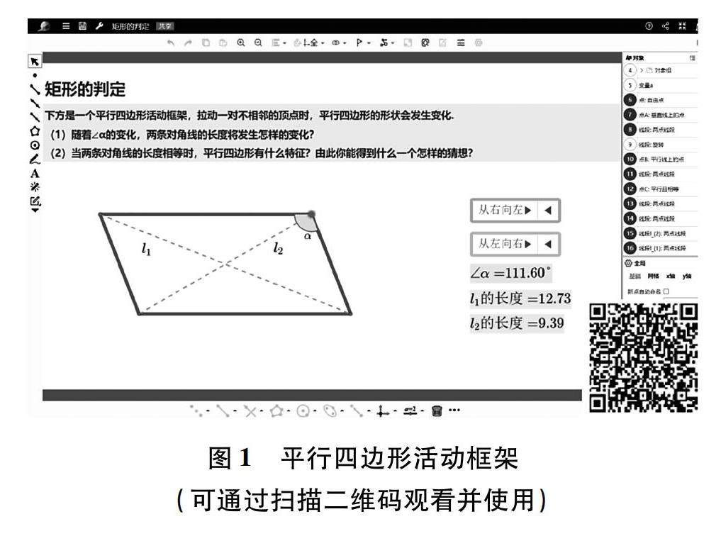 摘 要:初中数学教学可以借助网络画板来开发资源,形成丰富的教学活动.本文就北师大版九年级上册第一章《特殊平行四边形》中的新授课、章节复习课、习题课的中相应课例应用网络画板进行绘制动态几何,促进学生的几何直观和推理能力的发展,并形成网络共享文件以期为初中数学教学提供一定的参考.