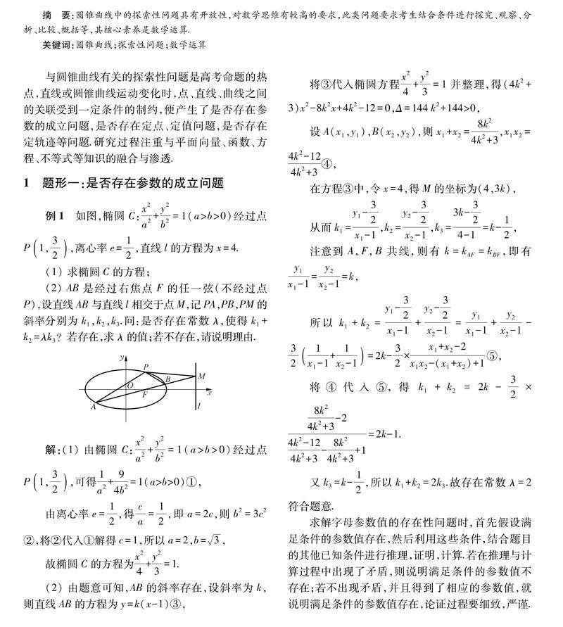 摘 要:圆锥曲线中的探索性问题具有开放性,对数学思维有较高的要求,此类问题要求考生结合条件进行探究、观察、分析、比较、概括等,其核心素养是数学运算.