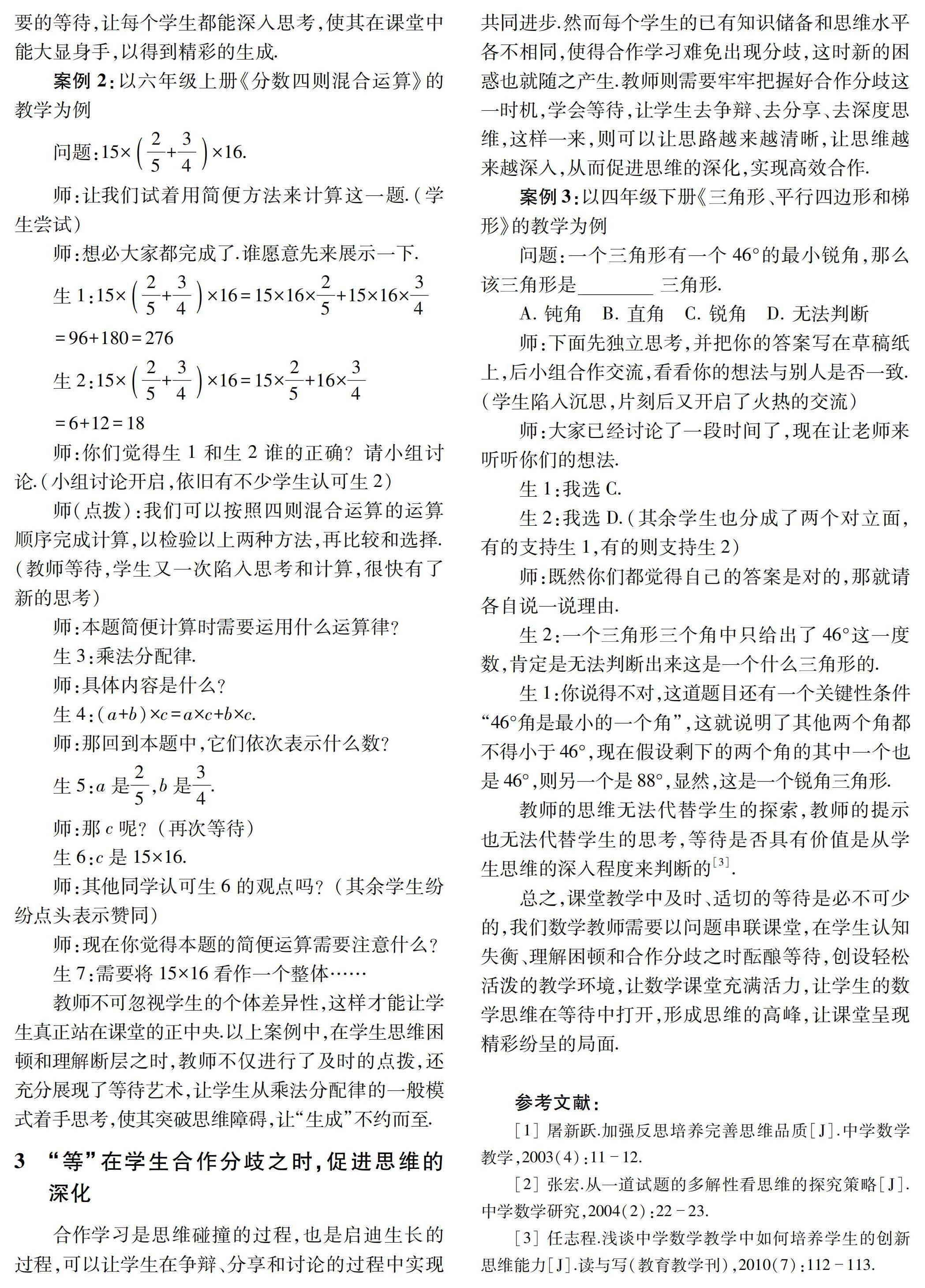 摘 要:适时、及时的等待艺术如何恰如其分地运用到具体的数学教学中,一线教师如何让学生的数学思维在“等待”中绽放,这是一个值得探讨的问题.本文研究者从实践角度给出了思考与做法.