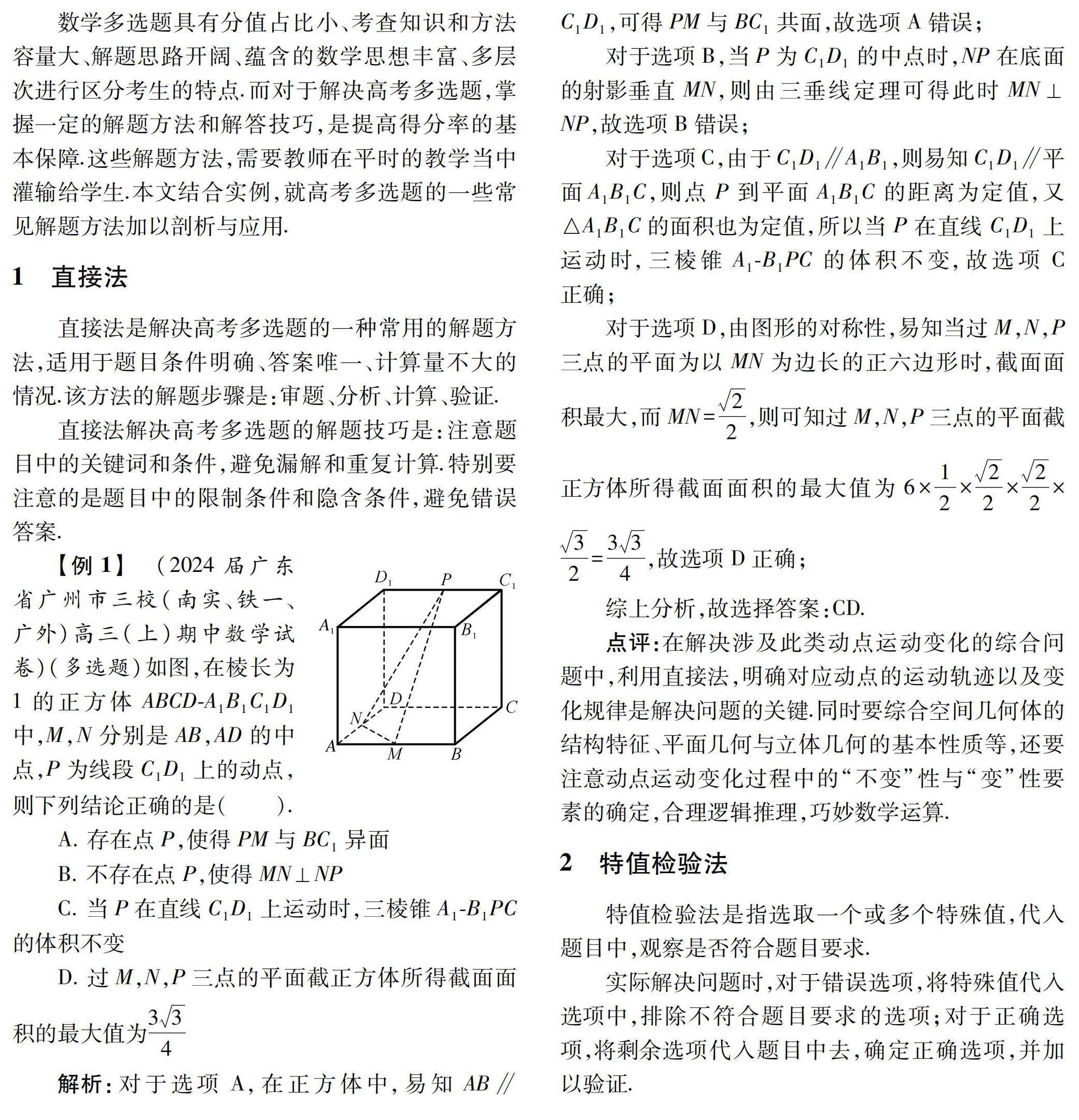 摘 要:新高考数学试卷中多选题的引入与设置,给高考命题带来了创新的亮点与能力的热点.本文结合近年高考多选题的考查情况、知识背景、问题设计等方式,选取针对性实例,阐述高考多选题的解题技巧与方法策略,总结规律启发思考,改进数学教学,促进数学学习与复习备考.