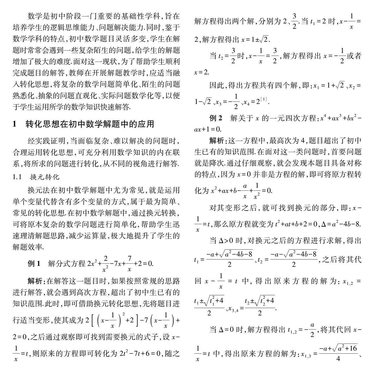 摘 要:转化是一种非常重要的数学思想,也是高效解题的思维方式.将其应用到数学解题教学中,可促进复杂问题简单化、陌生问题熟悉化、抽象问题直观化等,降低了学生的解题难度,显著提升了学生的数学解题能力.本文就以此切入,结合例题,针对转化思想在初中数学解题教学中的具体应用,进行了详细的探究,具备一定的参考(剩余5787字)