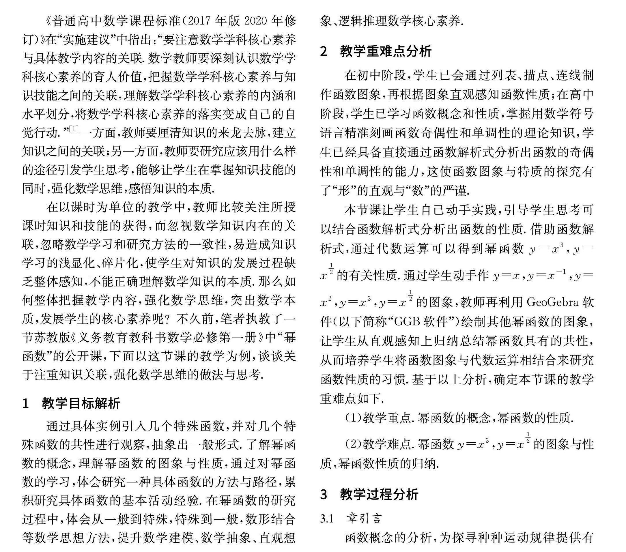 摘 要:“幂函数”是“函数概念与性质”的延续、拓展和应用,“幂函数”担负着应用已学知识来研究具体函数的作用,“幂函数”的研究方法、路径对后面学习“指数函数、对数函数、三角函数”起着示范作用.在“幂函数”的研究过程中,须整体把握教学内容,注重知识关联;须经历完整的研究过程,强化数学思维.