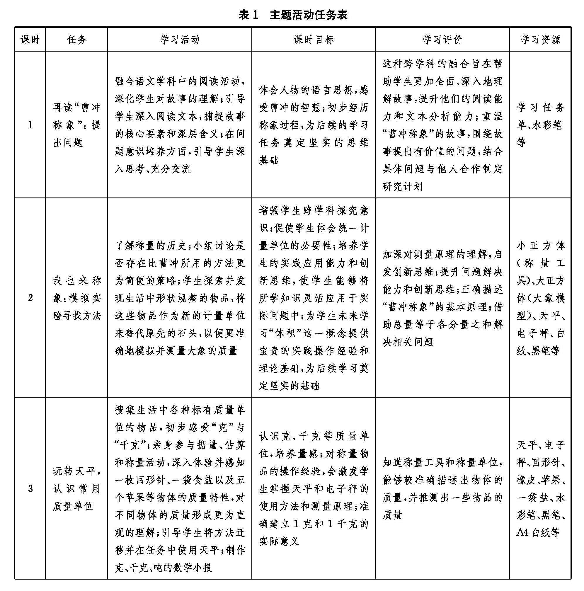 摘 要:《义务教育数学课程标准(2022年版)》要求在小学阶段将主题式学习融入综合实践活动中.本文以“曹冲称象的故事”为例开展数学主题活动,立足数学文化内涵,整体构建了活动目标与内容规划.在主题活动中,教师通过创设情境引导学生提出问题、深入思考、得出结论,积累数学主题活动经验,从而培养学(剩余4227字)