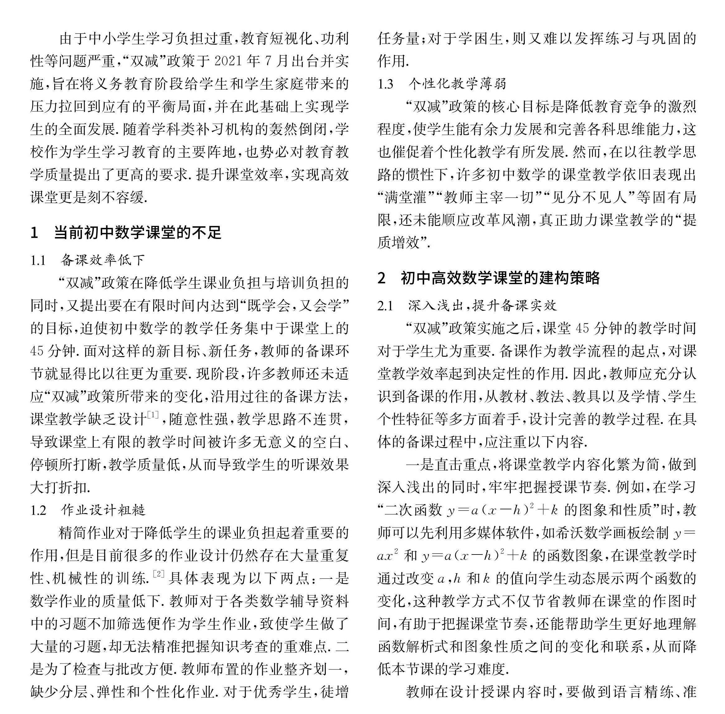 摘 要:为适应“双减”背景的新形势,如何建构高效的初中数学课堂,对于学生更好地回归校园生活,以及减轻家长和孩子产生的焦虑等问题具有重要意义.本文主要围绕当前初中数学课堂的“三点不足”展开讨论,并针对性地提出高效课堂的建构策略,旨在提高课堂的教学效率.
