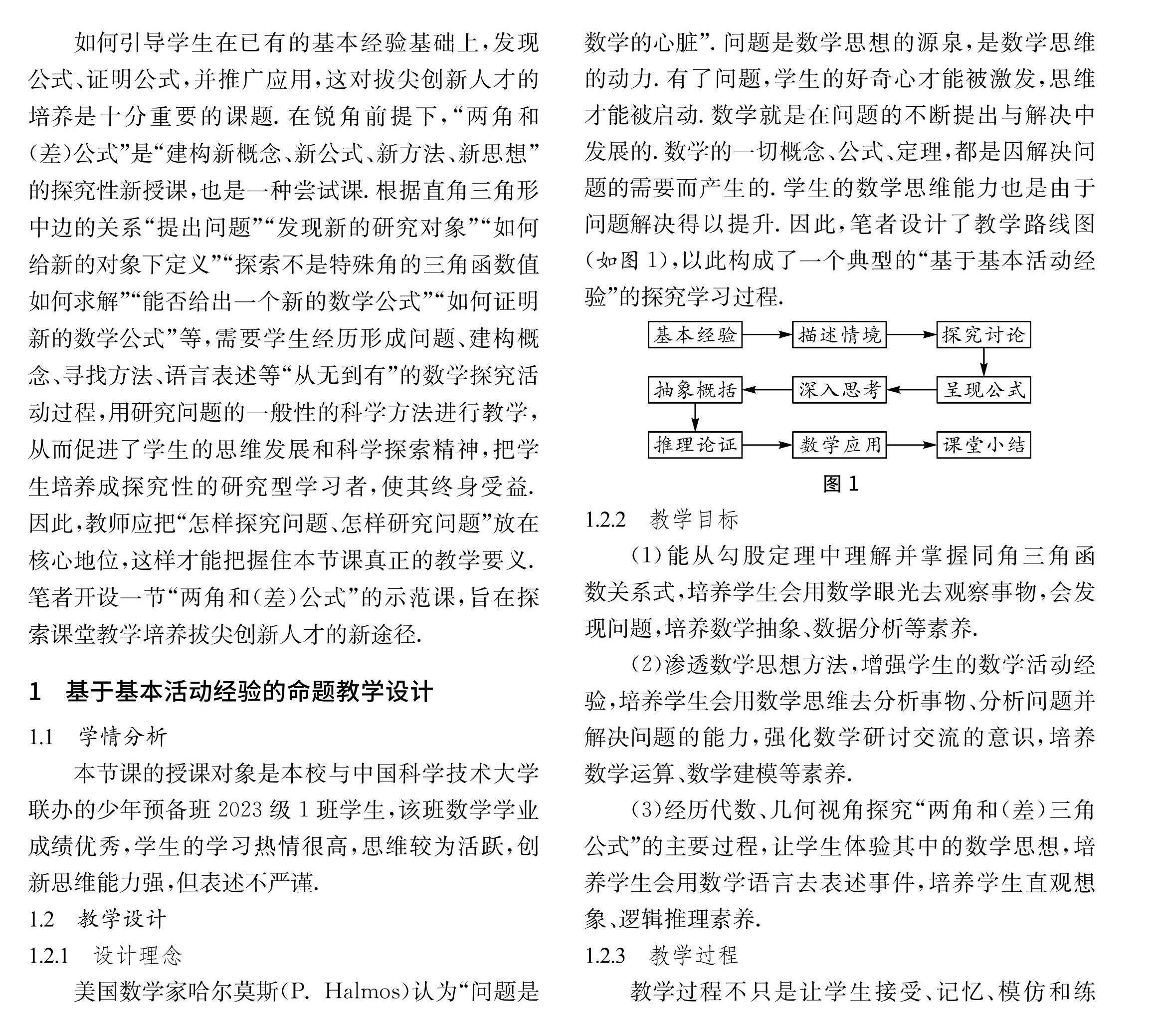 摘 要:“两角和(差)公式”是中学数学的重要公式,是在学生已经熟悉的直角三角形知识的基础上由于解决问题的需要自然生长出来的新知识.本文旨在使学生体验两角和(差)三角公式的必要性和优越性,理解锐角同角三角函数之间的关系以及几何意义,掌握两角和(差)公式,感悟公式推导过程中的直观想象和数学运算的价值.