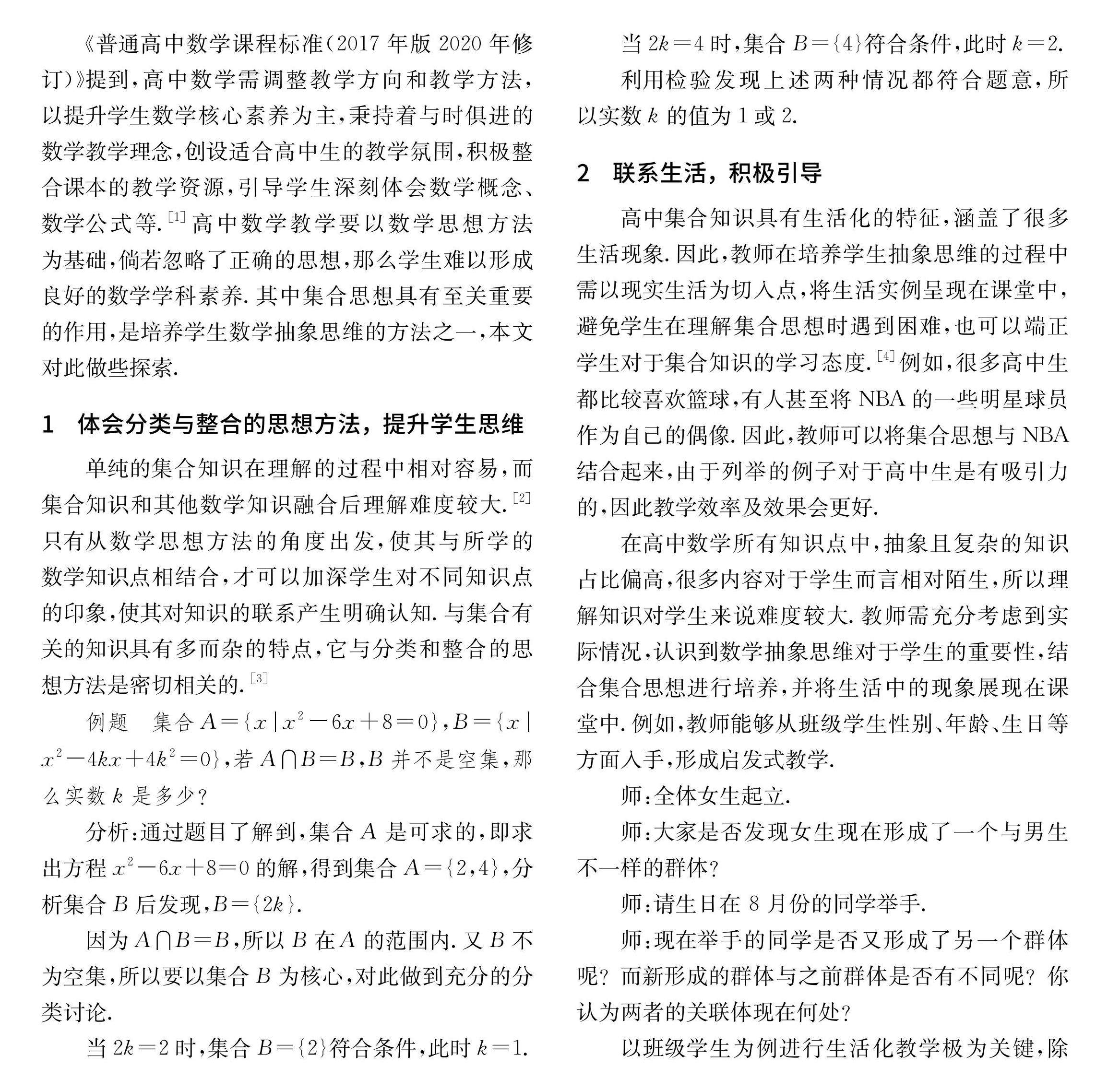 摘 要:高中数学是涉及较多抽象知识点的重要课程,与学生高考成绩、数学核心素养、实际问题的解决息息相关,是学生实现全面发展的影响因素之一.而集合是高中数学的重要知识点,教师应以集合思想为切入点,引导学生形成抽象思维,并了解实际生活中的现象等.