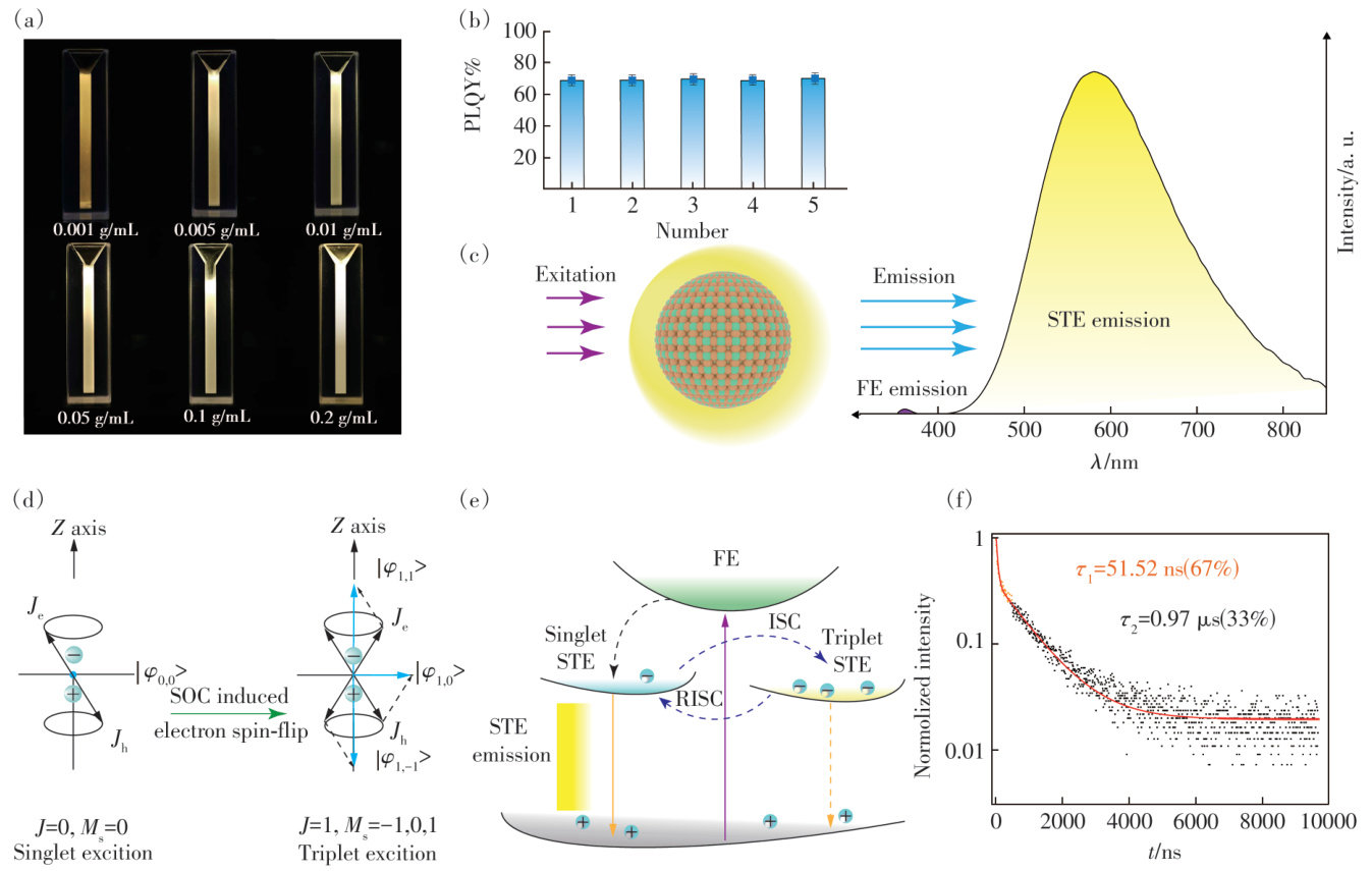 Abstract:The emission of ZnO in the visible light region has a long and complicated history. In previous studies, researchers have attributed the emissions in the visible light region to the existence of impurities or structural defects (such as oxygen vacancies,zinc vacancies,zinc interstitials,surface states). However,there are still certain differ⁃ ences. For quantum dots(QDs)with good crystallinity and high luminous efficiency,it is contradictory to attribute their emission mechanism in the visible light region to the defect model. This paper proposes a multiple bright singlet/ triplet hybrid self-trapped exciton emission model for ZnO QDs,whose luminescence range covers from 400 nm to 700nm . The Photoluminescence quantum yield(PLQY)of singlet exciton and triplet exciton emission are 45.56% and 22. 44% ,respectively. Thanks to their good transparency and bright triplet excitons,we have explored the X-ray detection imaging by ZnO QDs as scintillator. The lowest detection limit of the ZnO QD scintillator for X -ray is as low as 64.89nGy/s ,which is lower than the dose required for X-ray medical imaging. This work puts forward a new mod⁃ el for visible emission in ZnO QDs,demonstrating a new type of transparent scintillator and their potential applica⁃ tion in X-ray imaging.