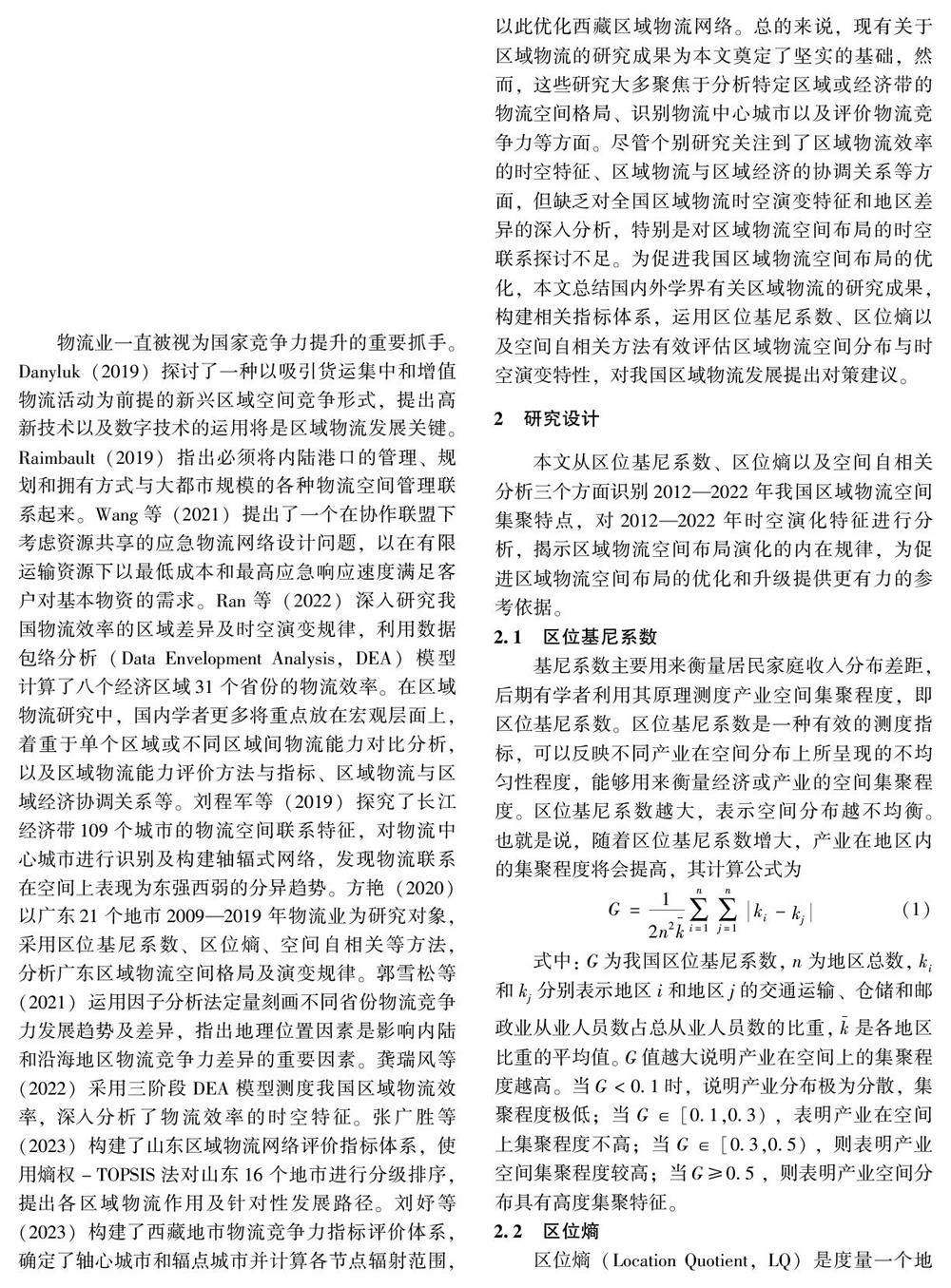 摘要: 物流业空间布局优化有助于提升地区的竞争力, 促进地区之间的合作与交流。基于我国31 个省份2012—2022年物流业数据, 采用了区位基尼系数、区位熵、空间自相关等方法, 从空间和时间视角对我国区域物流空间分布与时空演变特征展开实证分析。结果表明, 我国区域物流产业集聚水平不高, 各地区物流业集聚水平与专业化水平差异性明显, 区域物流存在正空间自相关特征, 各地区呈现从分散到集聚再到分散的发展态势。(剩余1202字)