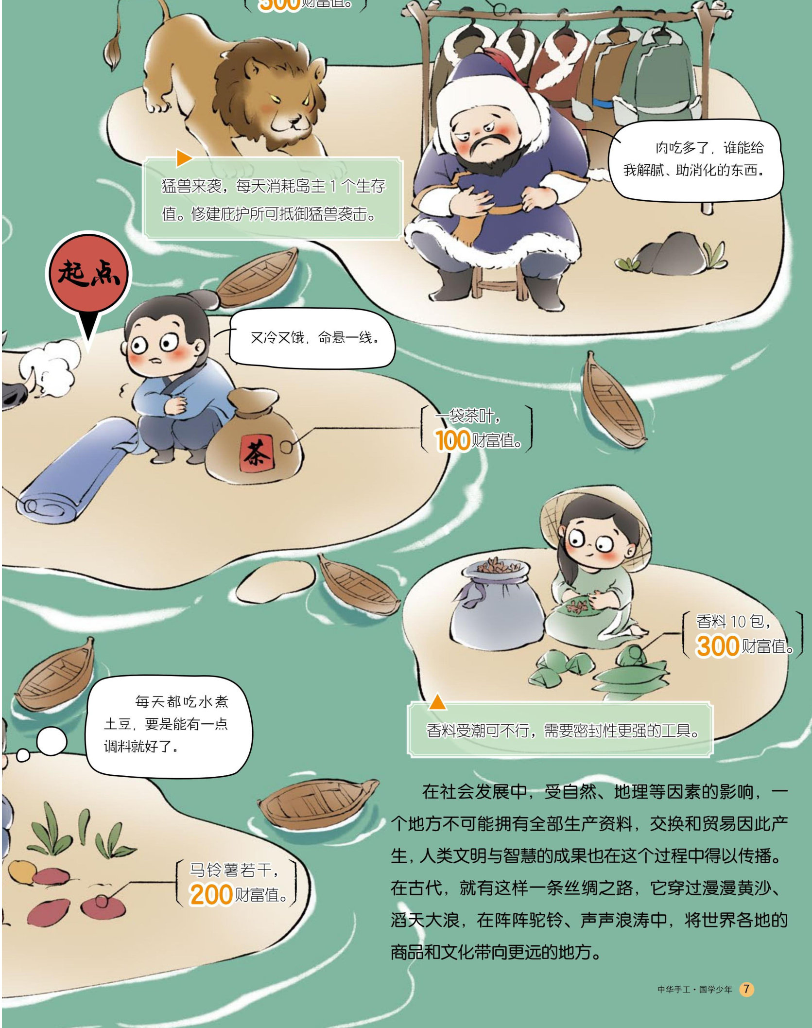 小船不幸沉没,你带着一匹丝绸、一袋茶叶流落荒岛。水资源短缺、食物匮乏、猛兽袭击等危机步步紧逼,你会怎样破局?短缺的物资从何处获取?发挥你的智慧,解决难题,赚取财富,过上幸福人生!