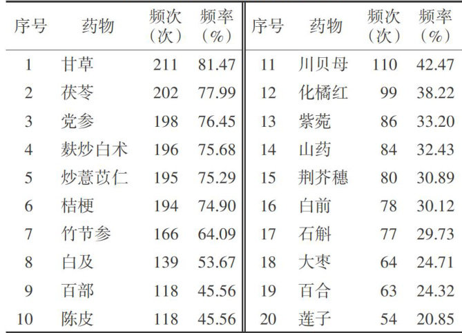 Abstract:Objective:To analyze the medication rules of Professor LIANG Bangshun in treating tuberculosis with Chinesemedicine basedondata mining.Methods:Theclinicaldataof patients with tuberculosis diagnosed and treated in the Chinese medicine ward andoutpatient departmentof Guangzhou Chest Hospital from May1,2021 to April 30, 2024 were collected and input into Microsoft Excel to establish a database for frequencyanalysis of medications, properties,flavors and meridian entries of Chinese herbs.SPSS Modeler software and R language were used to analyze the asociationrules,clustering and corelation ofthedata.Results:Atotalof 259 prescriptions of Chinese medicine were included,involving 149 Chineseherbs,withatotal frequencyof3417 times.The most frequentlyused Chinese herbswereGlycyrrhizae Radix etRhizoma,followed by Poria,CodonopsisRadix,Atractylodis Macrocephalae Rhizoma stir-fried with bran,fried Coicis Semen,etc.The four propertiesof theChinese herbs were mostly warm, cooland neutral,the five flavors were mostly sweet,biterand pungent,andthe meridian entries were mainlythe lung and spleen.The associationrules analysis showed that Atractylodis Macrocephalae Rhizoma stir-fried with branGlycyrhizae RadixetRhizoma was with the highestsupport,folowed by CodonopsisRadix-Glycyrhizae Radix et Rhizoma,andPoria-Atractylodis Macrocephalae Rhizoma stir-fried with bran was with the highest numberof cooccurrences.Three core combinations of Chinese herbs were obtainedbyclustering analysis,and the corelation between the three groups of Chinese herbs was higher.Conclusion:Inthe treatment of tuberculosis,Professor LIANG