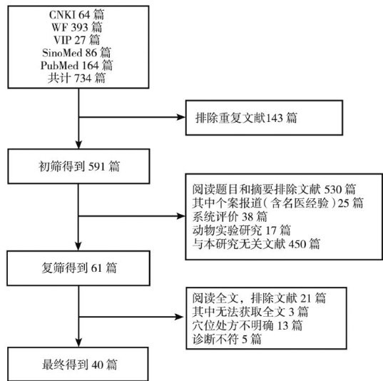 Abstract:Objective:To summarize the acupoint selection patterns in the acupuncture and moxibustion treatment foratopic dermatitis(AD)using data mining technology.Methods:Clinicalresearch literature on acupuncture and moxibustion treatment for AD from January1,2014,to May 31,2024,was retrieved from CNKI, SinoMed,Wanfang,VIP,and PubMed databases to construct an acupuncture and moxibustion prescription database for AD.Using Excel and SPSS statistical software,the frequency of acupoint use and meridian atribution were analyzed,and assciation rule and cluster analyses were conducted to summarize the acupoint selection paterns. Results:A total of 4Oclinicalresearch articles were included,with 40acupunctureand moxibustion prescriptions collcted,involving 39 acupoints and atotal usage frequencyof 185times.The topfive mostfrequentlyusedacupoints were Quchi(LI1) point,Xuehai(SPlO) point,Zusanli(ST36)point,Sanyinjiao(SP6) point,and Yinlingquan (SP9)point.The top five meridians were thespleen meridian of foot-Taiyin,large intestine meridianof handYangming,stomach meridian of fot-Yangming,conception vessel,andbladder meridian of fot-Taiyang. Asociation rule analysis showed strong associations between Quchi((LI1) point and Xuehai(SP1O)point,as well as Quchi(LI1) point and Zusanli((ST36)point.Cluster analysis of high-frequency acupoints divided theacupoints into three major categories.Conclusion:Acupuncture and moxibustion treatment for AD focuses on selecting acupoints from the hand and foot Yangming meridians and the spleen meridian of foot-Taiyin,with commonly used acupoints including Quchi(LI11)point,Xuehai(SP1O)point,and Zusanli(ST36)point,reflecting the therapeutic principles of dispelling wind, clearing heat, strengthening the spleen,and nourishing blood.